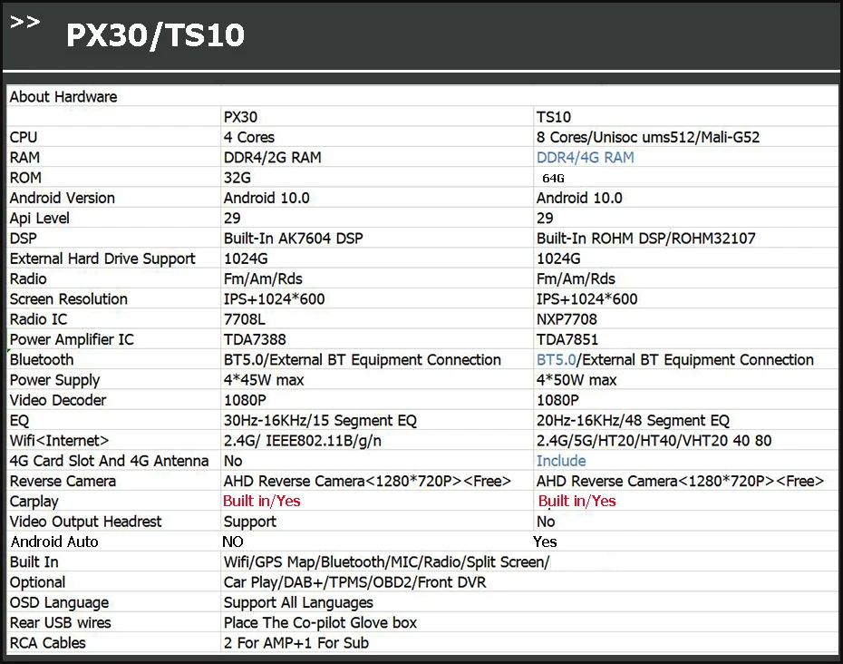 > TS10(Wifi с 4G)= 8 ядер <4 ядра + 4 ядра> + 4G RAM + 64G ROM + DSP + поддержка установки 4G sim-карты + Wifi + AHD камера заднего вида/