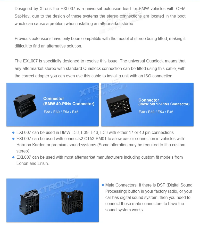 Разработан Xtrons EXL007 является универсальным удлинителем для автомобилей BMW с OEM Sat-Nav, благодаря дизайну этих систем стерео соединения расположены в загрузке, что может вызвать проблему при установке послепродажного стерео. Предыдущие расширения были совместимы только с моделью стерео, что делает его трудно найти Альтернативное решение EXL007 специально разработан для решения этой проблемы, универсальный Квадрокоптер означает, что любой послепродажный стерео со стандартным четырехзамковым соединением может быть установлен с помощью этого кабеля, С правильным адаптером вы даже можете использовать этот кабель для установки устройства с подключением ISO.