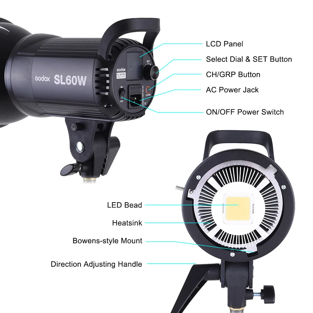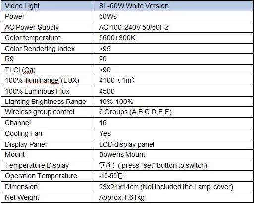 Godox SL-60 видео Светильник обеспечивает высокую светильник яркость и индекс цветопередачи с высоким качеством светодиодный бусины, объекты подлинное. Светильник для видеозаписи оснащен пультом дистанционного управления для регулировки яркости и распределения яркости по беспроводной связи, а также большой ЖК-панелью для точного отображения яркости и температуры. Светильник обеспечивает стабильное освещение для записи видео, фотосессии, свадебной съемки и т. Д. Особенности -Светодиодный светильник, 60 Вт, высокое качество, высокая яркость и стабильный источник питания. -Индекс цветопередачи составляет более 95, R9-90, TLCI(Qa)-более 90, представляя объекты аутентично. -Оснащенный беспроводным пультом дистанционного управления, беспроводной светильник с регулируемой яркостью, беспроводная система распределения 433 МГц (6 групп и 16 каналов) -ЖК-панель большого размера для точной и простой работы. Настройки, автоматическое сохранение. -С специализированных защитную крышку, чтобы защитить светодиодный бусины эффективно. -С высококачественным радиатором и встроенным вентилятором охлаждения, обеспечивающим превосходное рассеивание тепла. -С функцией контроля температуры, чтобы предотвратить перегрев. -Маленький размер, легкий и портативный. -С креплением Bowens, чтобы добавить различные аксессуары, такие как софтбокс, snoot и т. д. Спецификации: Видео светильник: SL-60W версия в белом цвете Мощность: 60Ws AC Питание: AC 100-240V 50/60Hz Цветовая температура: 5600 ± 300K Индекс цветопередачи: >95 R9: 90 TLCI (Qa): >90 100% подсветка (люкс): 4100(1 м) 100% Световой поток: 4500 Освещение Яркость диапазон: 10%-100% Беспроводная группа управления: 6 групп (A,B,C,D,E,F) Канал: 16 Вентилятор охлаждения: Да Панель дисплея: панель ЖК-дисплея Крепление: Крепление Bowens Температурный дисплей: F/C (нажмите кнопку «set», чтобы переключиться) Рабочая температура: -10-50C Размеры: 23x24x14 см (лампа не входит в комплект) Вес нетто: около 1,61кг Пульт дистанционного управления: RC-A5 Питание: 3,0 V (ААА * 2)(не входят в комплект поставки) Беспроводная Частота: 433 МГц Расстояние (пустота): ≤ 20 м Канал: 16 каналов Группа: 6 групп (A,B,C,D,E,F) Время в режиме ожидания: более одного года Рабочая температура: -10-50C Размер: 120x38x15mm Вес нетто: 30 г SL60W только посылка включает в себя: 1 x SL-60W светодиодный видео светильник (белый вариант) 1 x пульт дистанционного управления 1 х шнур питания 1 чехол для лампы 1 х Отражатель 1 x Руководство пользователя