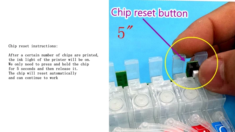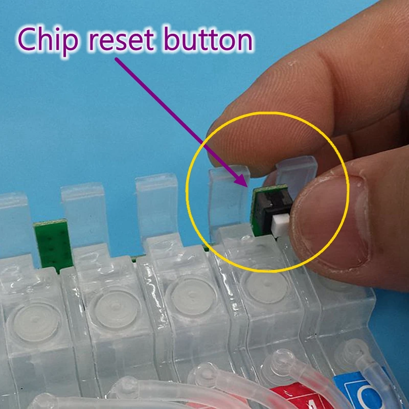 Когда нет чернил, мигает красный светильник кнопки замены чернил. Нажмите кнопку замены чернил. После того, как чернильный автомобиль переместится в положение замены чернил, удерживайте чип-переключатель на чернильном картридже, а затем нажмите кнопку замены чернил снова. Чернильный автомобиль вернется в свое положениеЗапчасти для принтера СНПЧ чернильный картридж чип аксессуары