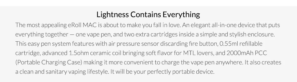 1x батарея eRoll Mac 1x eRoll Mac портативный зарядный чехол 3x картридж eRoll Mac 1x eRoll Mac PCC зарядный кабель 1x Руководство пользователя 1x гарантийный талон
