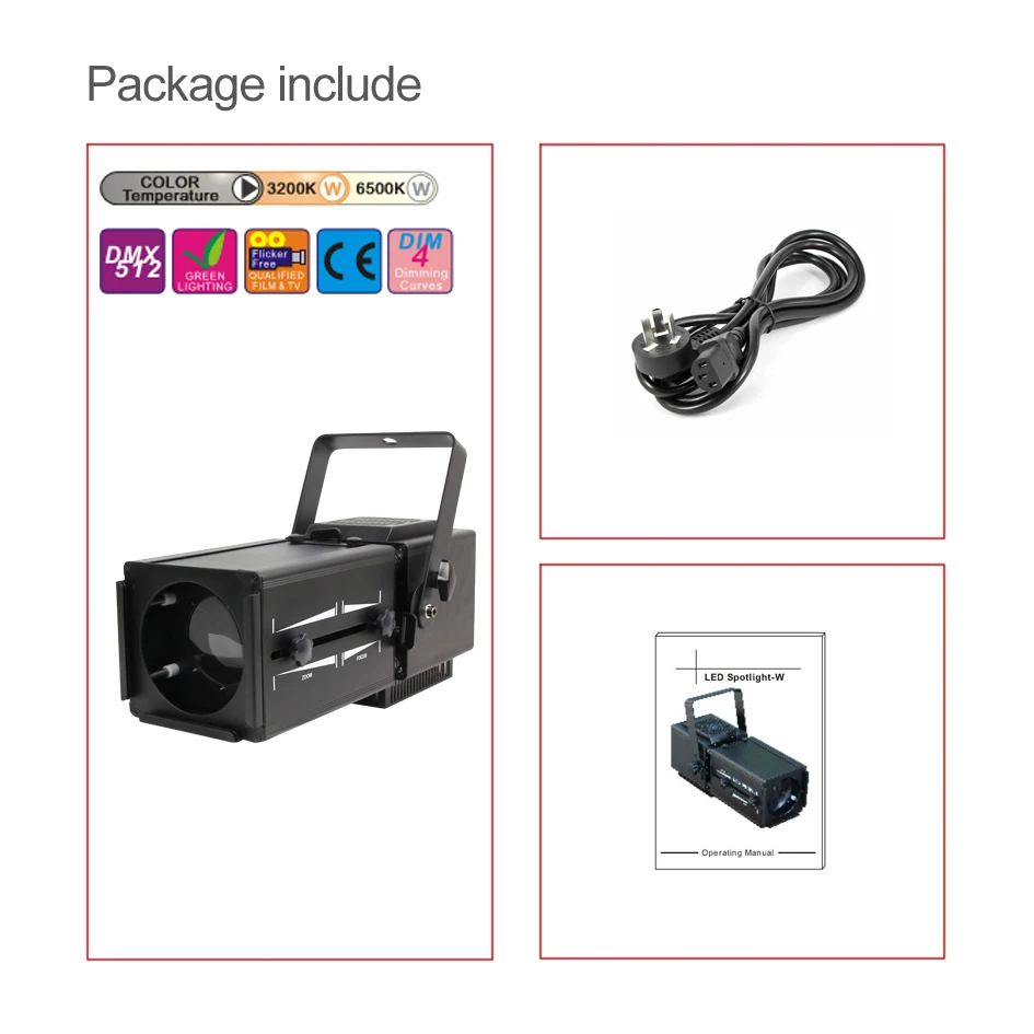 Источник светодиодов: 1 белый 60 Вт светодиод (3200 к), CRI> 90; (6500 к светодиод доступен) Оптическая Группа: угол луча 13-35 градусов; с высокоэффективной оптической системой Управление: 3 канала DMX; ЖК-дисплей + 4 мягких ключа; 4 выбираемых кривых затемнения Подключение: Power CON In & Out; 3-полюсный DMX In & Out (5-полюсный DMX в наличии) Напряжение: Электронный Полный диапазон переменного тока 90-260 В 50/60 Гц Максимальная мощность: 60 Вт Размеры: Размер: 35x18x16 см Вес: 10,5 кг