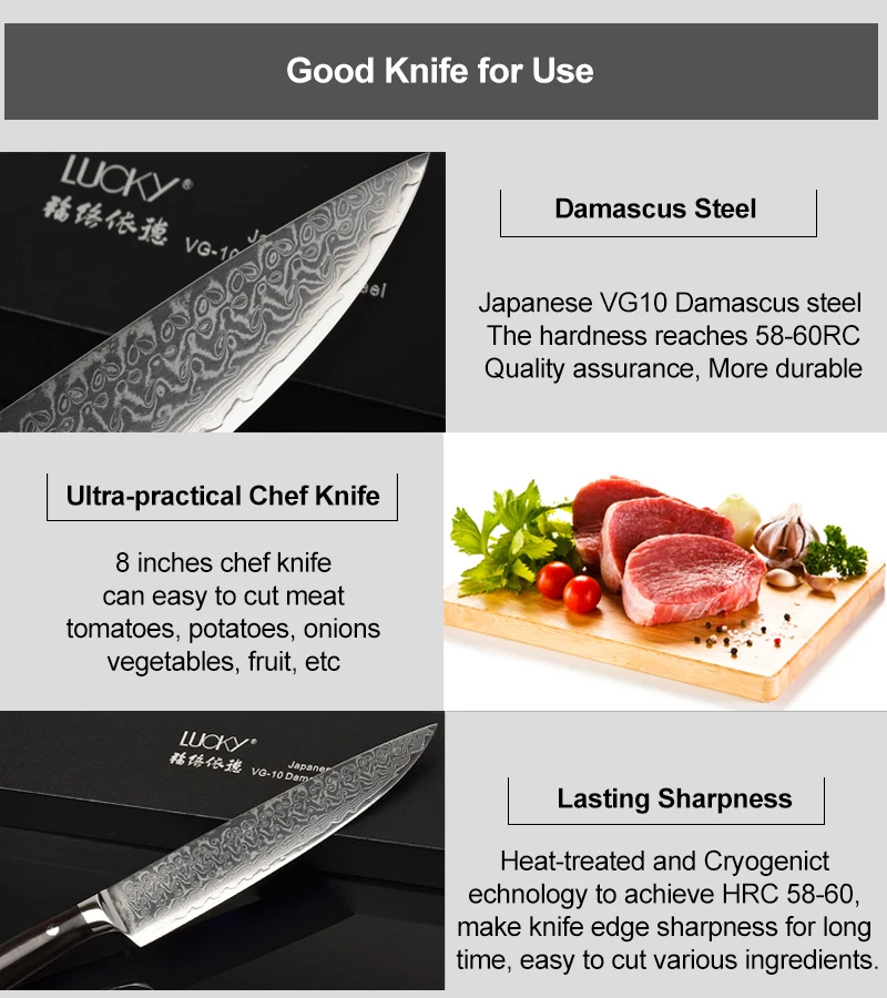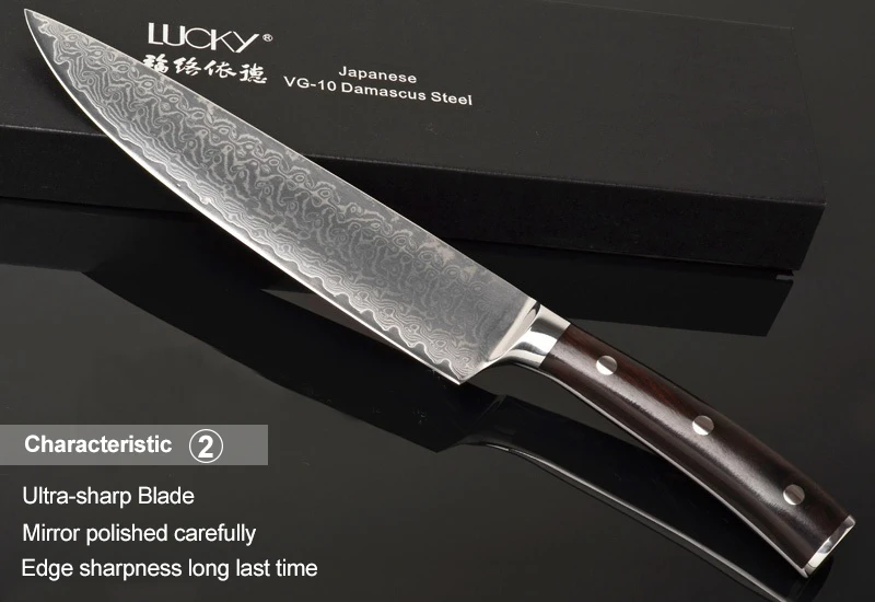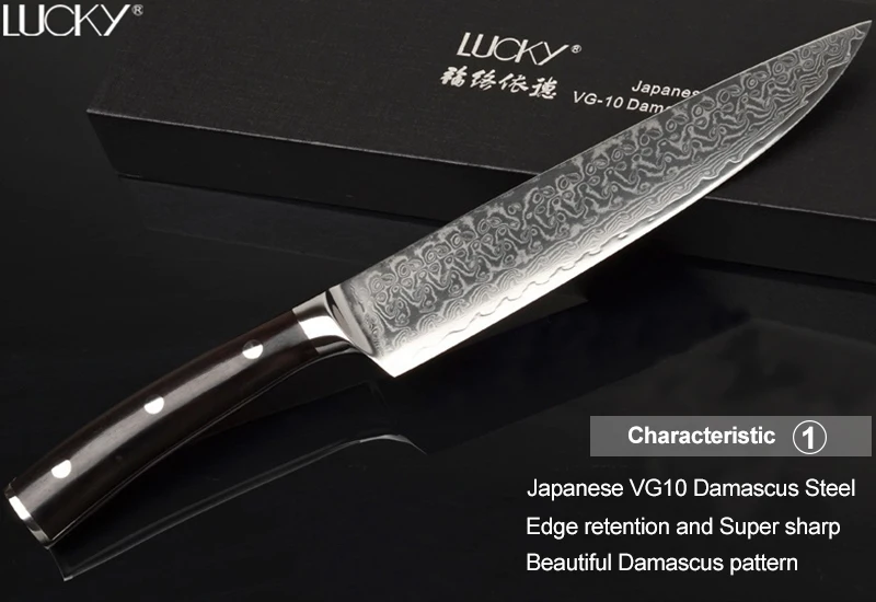 Исключительная резкость-Этот нож приносит вам сверхчеткость. Это лезвие скользит через мясо, рыбу и овощи с минимальным усилием. Ультра-острые края удерживания-Эксклюзивная термообработка-криогенная обработка 80 градусов для достижения HRC 58-60 делает наши лезвия ножей чрезвычайно острыми в течение удивительно длительного времени. Signature 67-слойный дамасский узор-Уникальный дамасский узор и VG-10 режущий сердечник предназначены для повышения прочности, повышения стойкости к пятнам и получения наилучших результатов резки. Идеальный вес полная длина черного дерева ручка-Черное дерево дышит красиво. Он также обеспечивает нескользящую и удобную фиксацию. Ручка легко моется, влагоустойчива и устойчива к бактериям. Коробка для тонкой презентации-Каждый нож входит в подарочную коробку. Идеальный подарок для друзей, которые гордились своими кулинарными навыками.