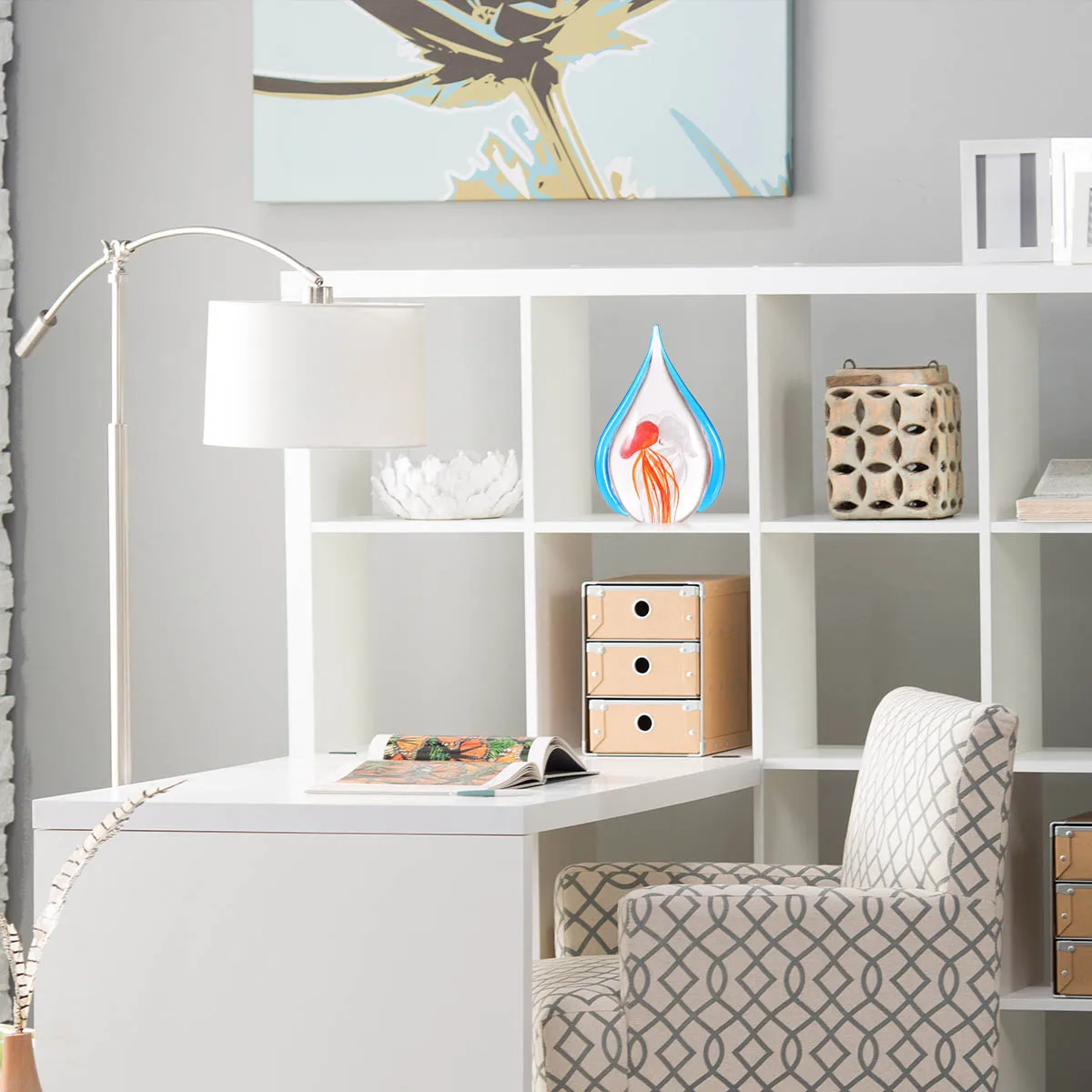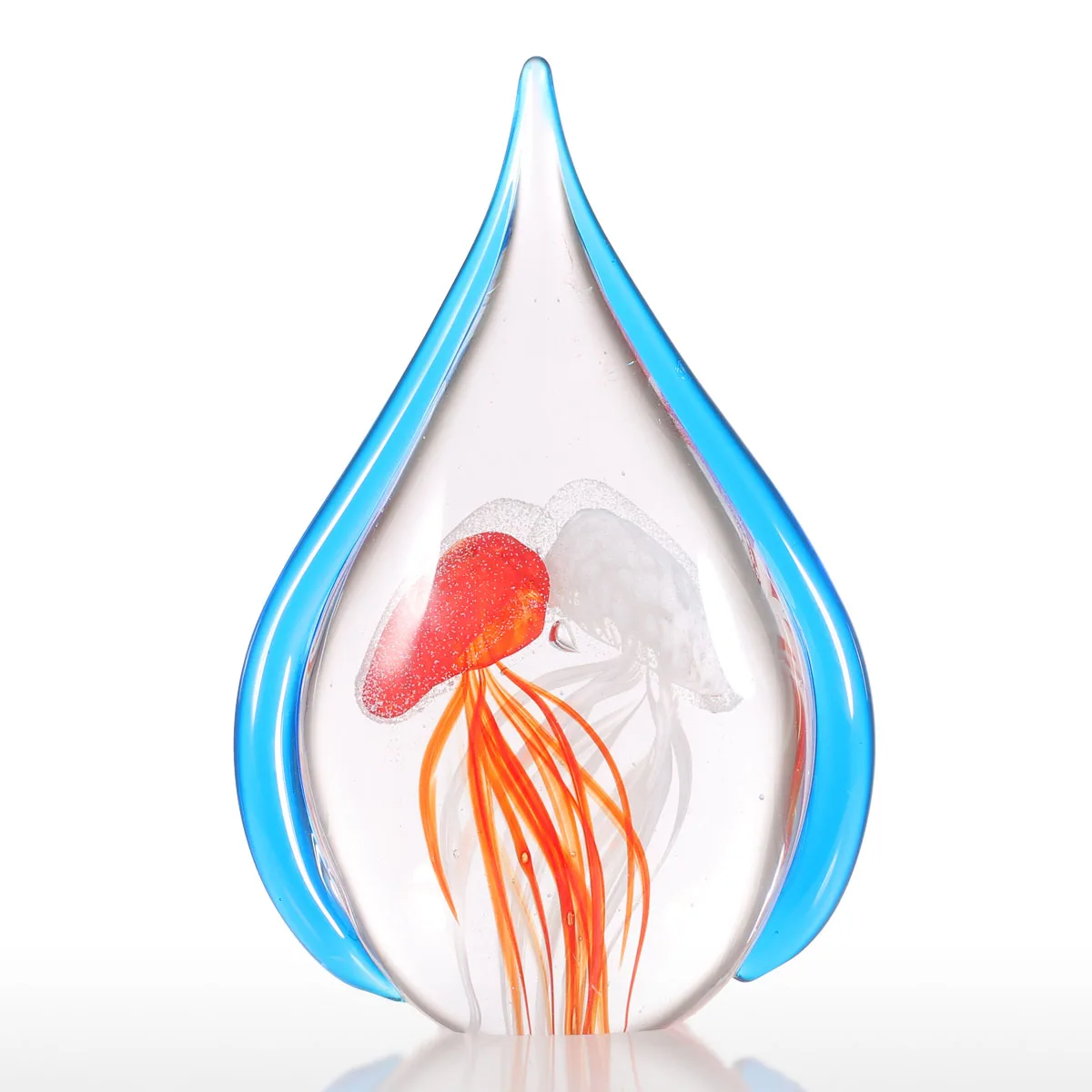 В середине голубого бордюра в форме каплевидного стекла красная и белая Медузы свободно плавают, как пара влюбленных, контраст цветов очевиден и гармоничен.
