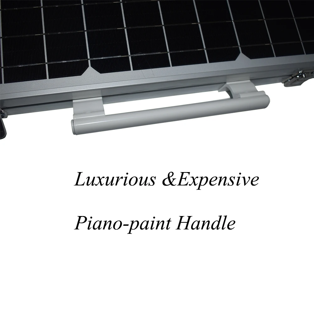 1, две стеклянные солнечные панели с температурой 50 Вт, что означает полную мощность 100 Вт 2, с регулируемыми ножками оправы, которые могут получить солнечный свет с лучшим углом 3, панели можно сложить или открыть с почти 180 градусов 4, с необходимым комплектом, Eaiser для использования и переноски 5, водонепроницаемый чехол и ручка, Eaiser и надежный в использовании 6. Для солнечных панелей срок службы может составлять 25 лет и 5 лет гарантии