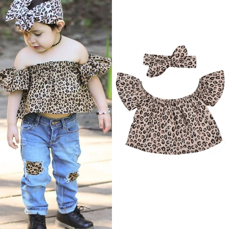 Леопардовый комплект из 2 предметов для маленьких девочек: топ с открытыми плечами + шарф!