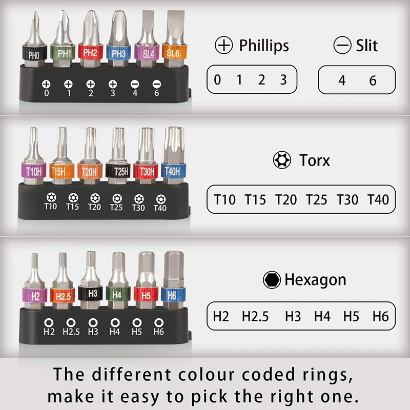3. 18 различных магнитных отверток с роликовым замком --- Phillips: PH0, PH1, PH2,PH3; Щелевые: 4,0, 6,0; Шестигранные: H2,H2.5,H3,H4,H5,H6; торкс: T10, T15, T20, T25, T30, T40.