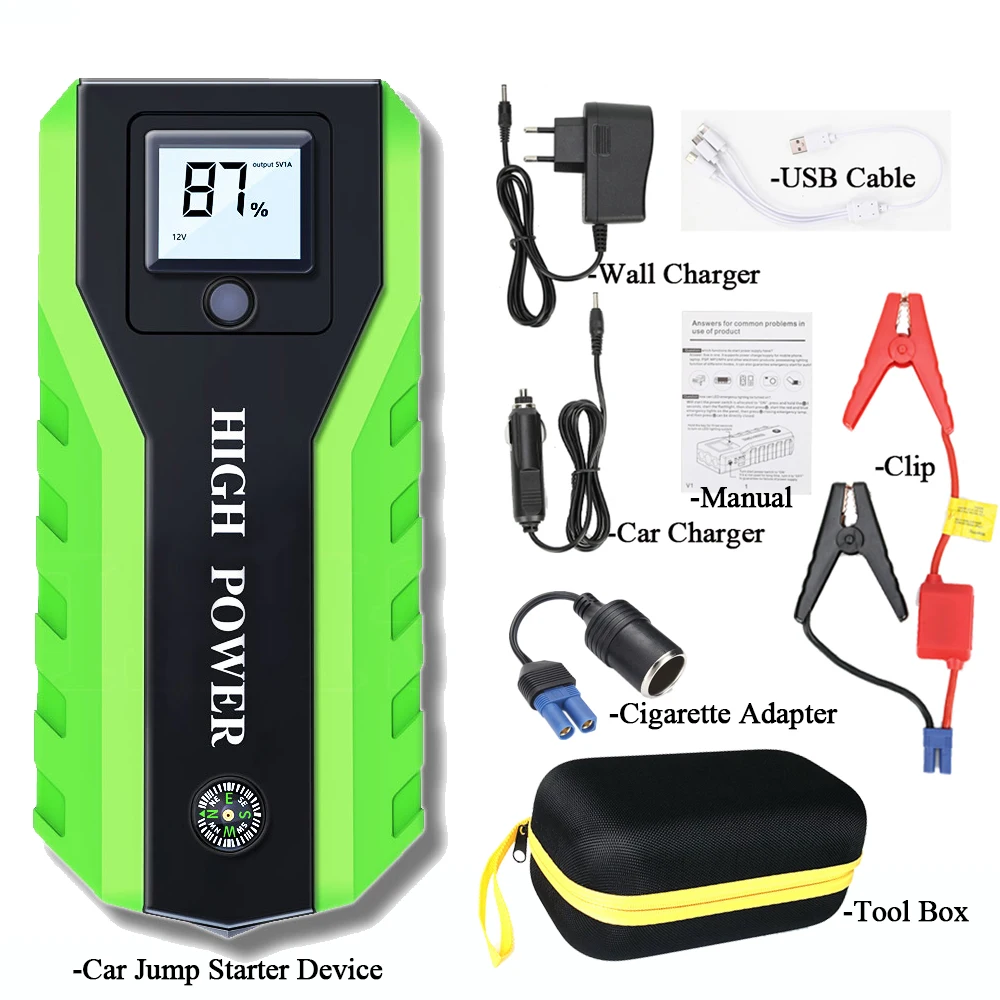 Стартер скачка автомобиля (Power bank) * 1 зажим батареи (красный = положительный; Черный = отрицательный) * 1 настенное зарядное устройство * 1 автомобильное зарядное устройство * 1 3 в 1 зарядный кабель * 1 Инструкция на английском языке * 1 Розничная коробка для инструментов * 1 маленький подарок * 1