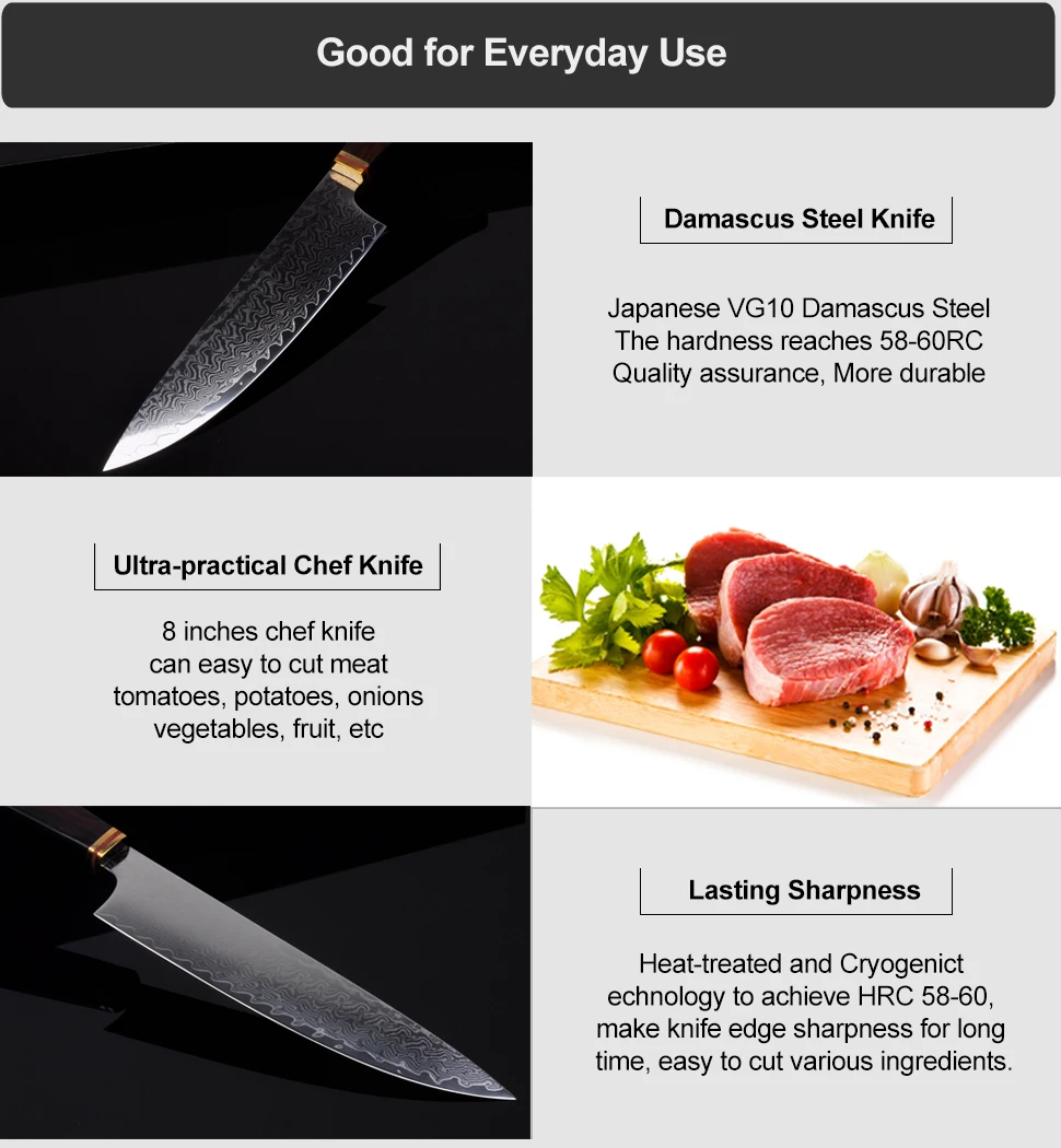 ● Прецизионное Кованое лезвие с высоким содержанием углерода из японской дамасской стали VG10 при 58-60 HRC, высокое содержание хрома (Cr) добавляется в сталь для стойкости к пятнам.