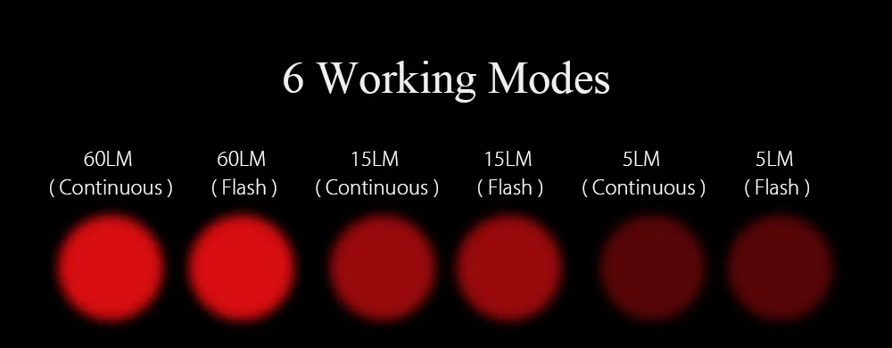 После включения питания, короткий нажмите кнопку переключателя, чтобы изменить режимы света, следуют 60LM непрерывной 60LM флэш-15LM непрерывной 15LM флэш-5LM непрерывной 5LM flash