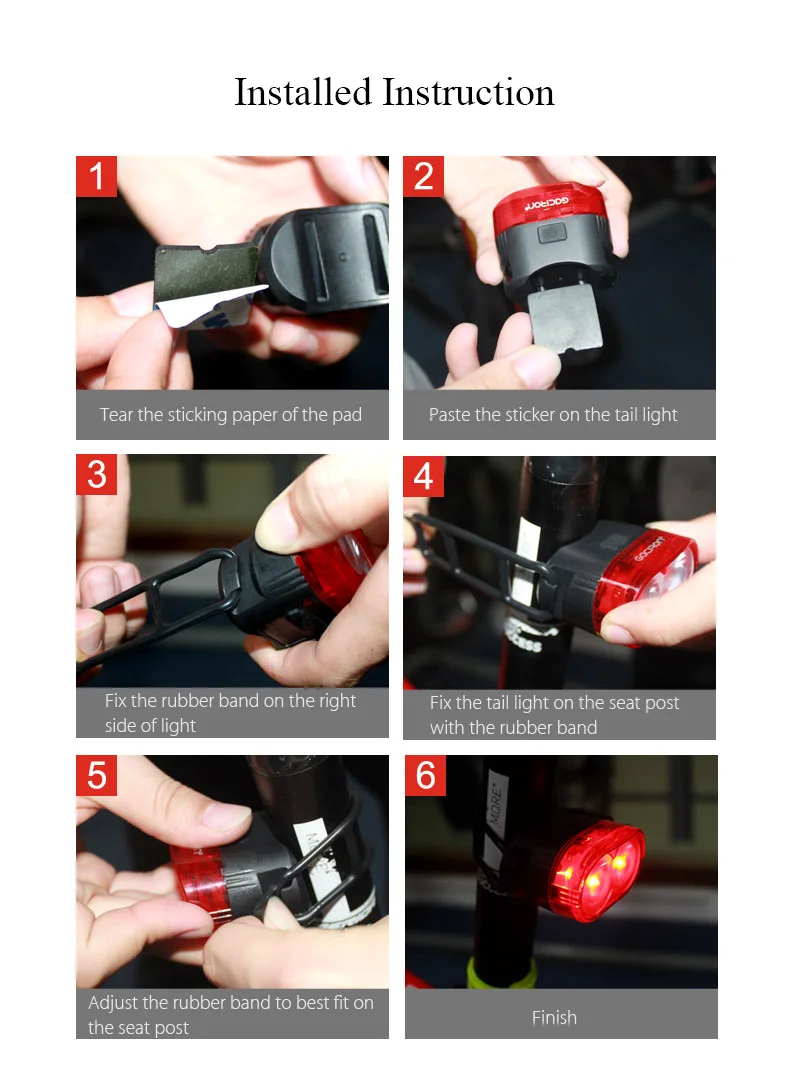 Технические характеристикиРазмеры и ВесВес продукта0,0740 кгПосылка вес0,1200 кгРазмер посылка (Д х Ш х В)9,50x8,00x4,50 см/3,74x3,15x1,77 дюймовПосылка содержаниеПосылка содержание1 х велосипедный задний фонарь, 1 х USB кабель, 1 х торчащая бумага, 1 х кронштейн, 1 x резина, 1 х Руководство пользователя на английском и китайском