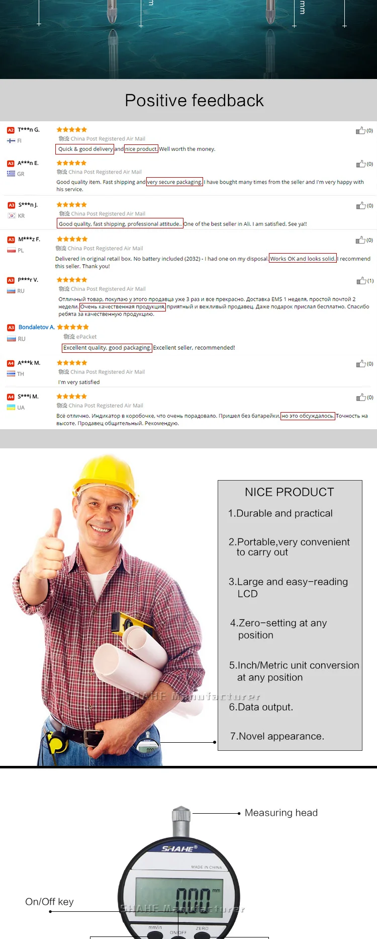 1. Измерительная головка из закаленного сплава и материал из нержавеющей стали 2. Компактная и прочная конструкция, удобная и стабильная работа 3. Быстрый дисплей измеренного значения на большом ЖК-экране 4. С кнопкой включения-выключения, автоматическое выключение 5,6 функциональных кнопок улучшает работоспособность 6. Нулевая Настройка в любом положении 7.мм/дюйм система измерения преобразования 8. Измерения для формы и допуска положения, например, выбега, Прямолинейность, параллелизм, плоскость и т. Д.