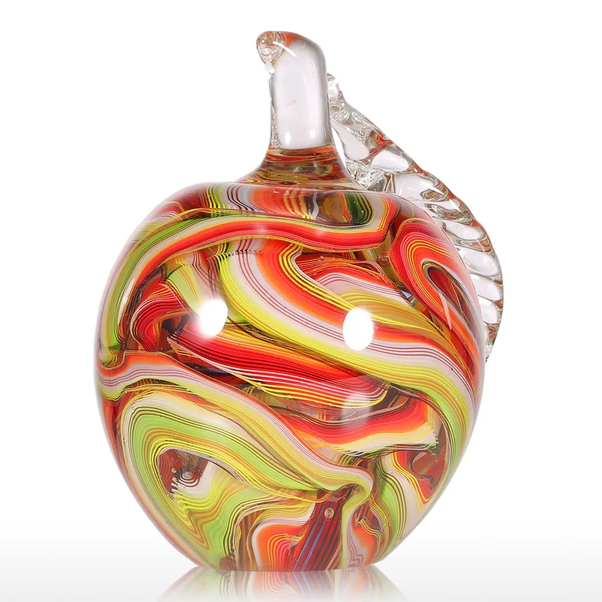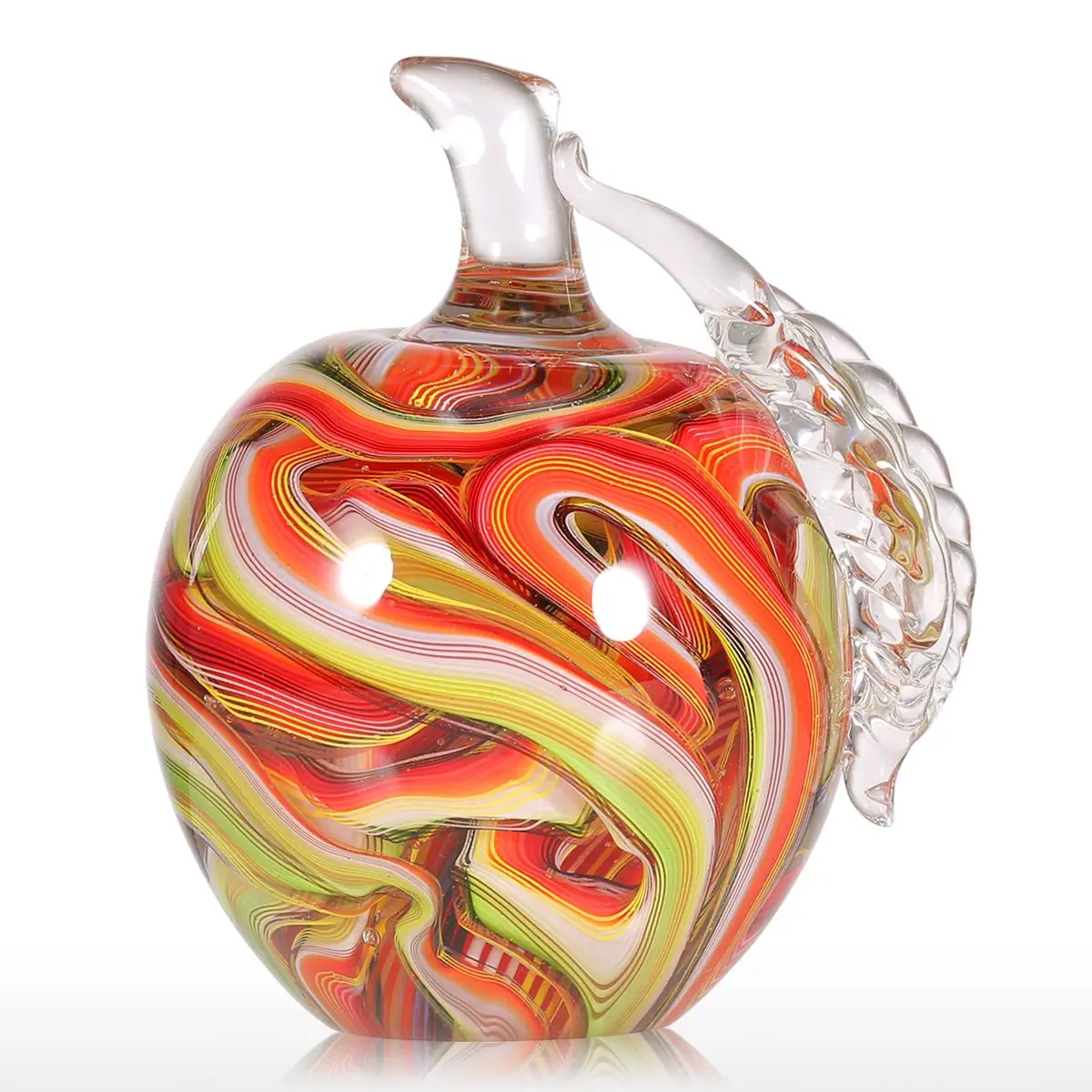 Это нежное разноцветное стекло apple. Внутри яблока находится изогнутая лента вокруг, на стебле есть кристально чистый лист с прозрачными венами. Богатое современное художественное чувство.