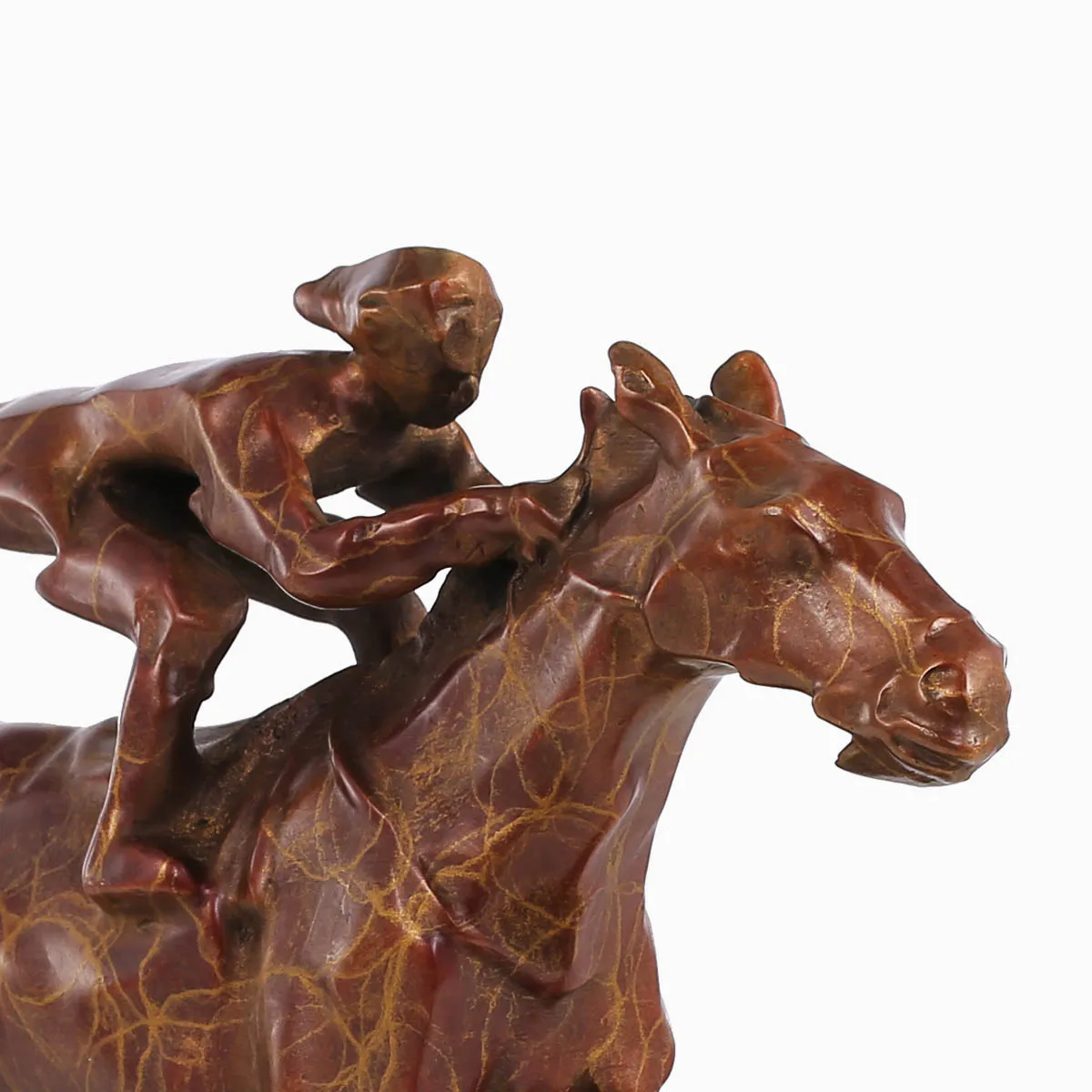 Это скульптура 3D моделирования, и она первоначально разработана художником Tomfeel, Питером реном. Художник создает изображение гоночной лошади и смелого гонщика абстрактным сводом. Командная работа хороша между гонщиком и лошадью. Кажется, что все они имеют возможность нажимать вперед. Эта лаконичная и современная скульптура формована, шлифована и окрашена профессиональным мастером с более чем 20 процессов. Медный блеск и естественные полосы на его поверхности делают его полным художественного привлекательности.