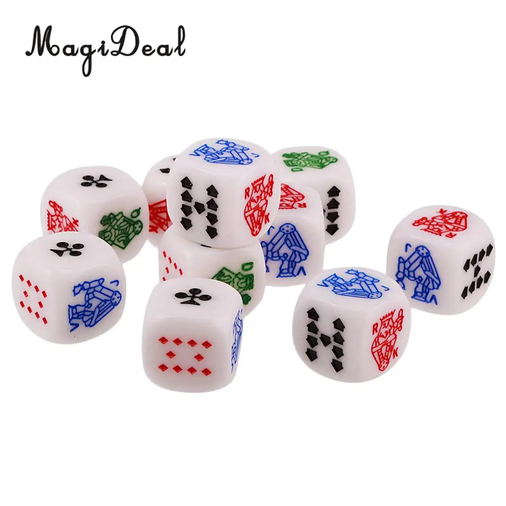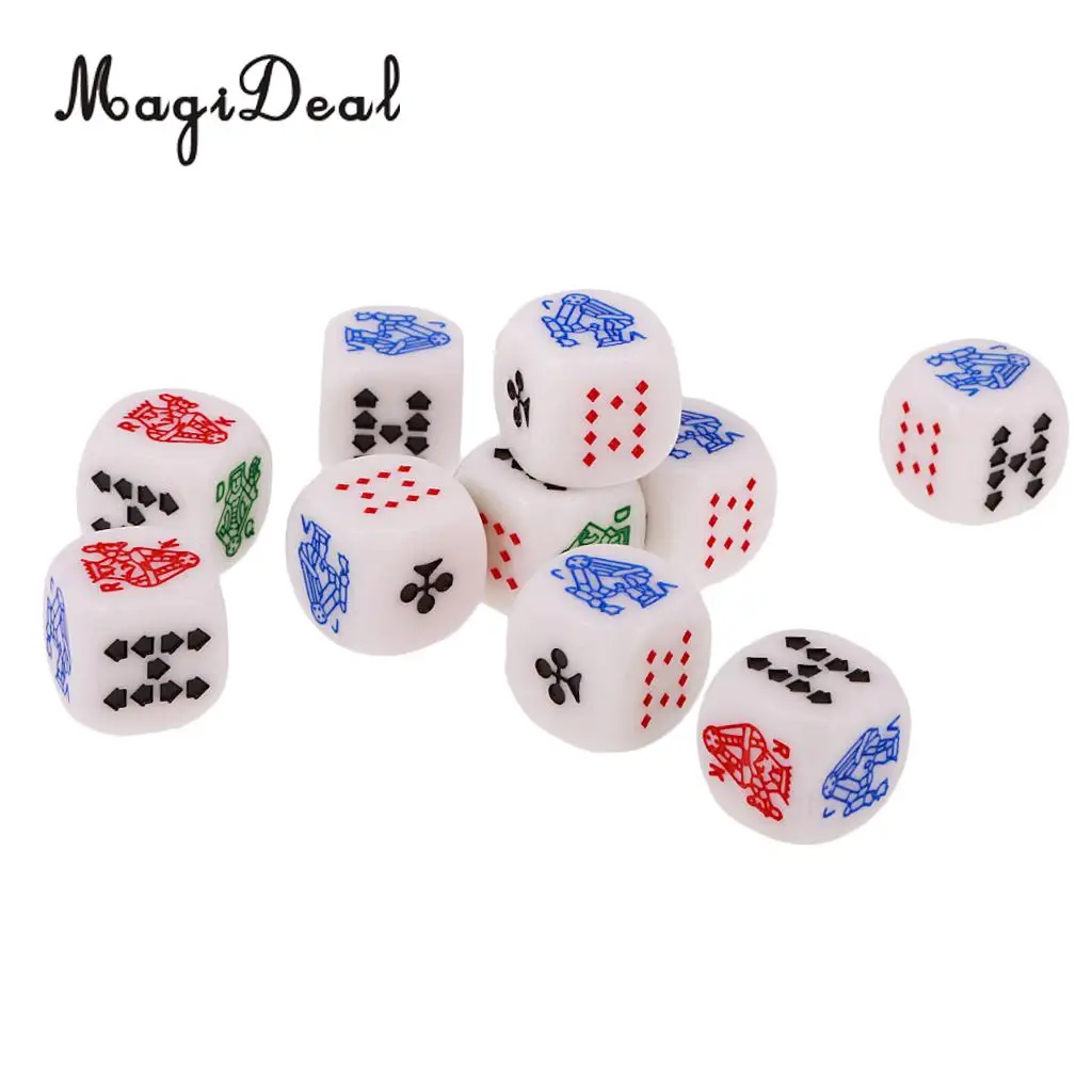 100% новые и высококачественные Материал: акрил Количество: 10 шт. Шесть сторонних, каждый с Ace, King, Queen, Jack, 10 и 9 Отлично подходит для игры в покер, игры в кости лжецов и других игр, требующих игры в покерТаблица размеров: