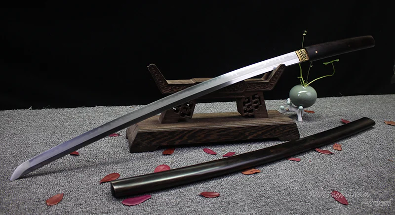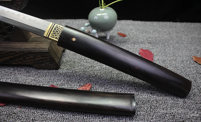 Blade shape and sturcture is according to the Japanese traditional construction methods, It is crafted with 1095 +1060 and folded steel, and is formed by thousands of hand forged,special clay is applied to the blade, and heat the blade at 750 degrees centigrade to form the real hamon. This process will produce a hard edge and soft the back after water quenching. And the bent of the katana is self formed through quenching,The blade is also broading polished through numerous coursed by hand craft, with point lines, razor sharp edge and fine clear temper line.