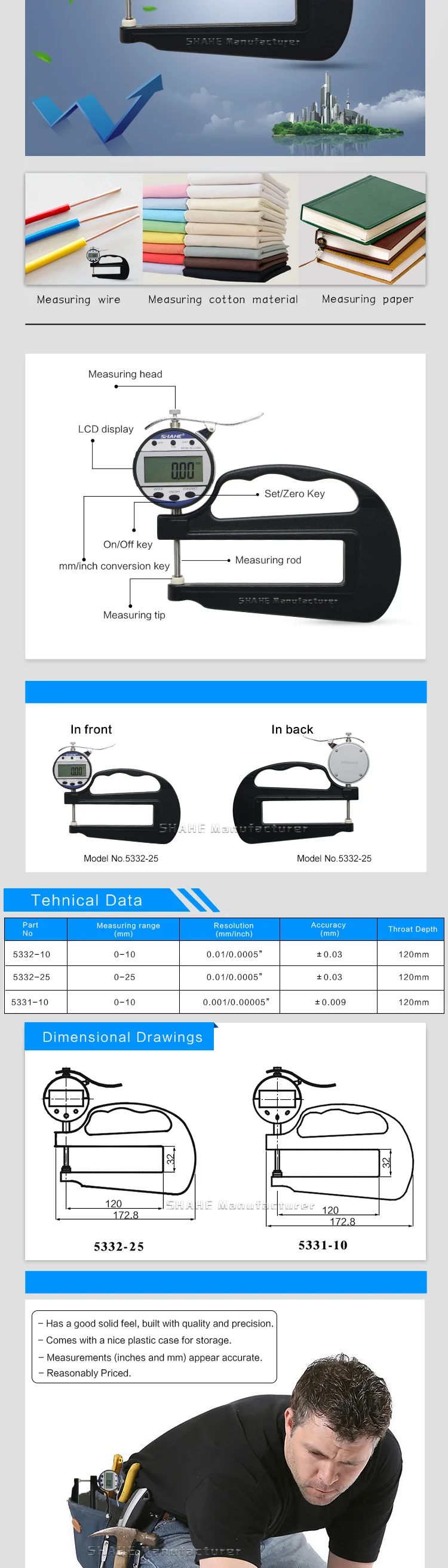 1. Керамическая измерительная головка, металлический корпус и ручка, компактная и прочная структура, удобная и стабильная работа 2. Быстрый дисплей измеренного значения на большом ЖК-экране 3. С выключателем питания и автоматическим выключением для опции 4. Нулевая Настройка в любом положении 5. Конвертация измерительной системы мм/дюйма 6,3 V CR2032 окружающей среды литиевая батарея 7. Три различных типа измерительной головки 8. Измерение толщины ювелирных изделий, кожи, металлической пленки, бумаги, резины, ткани и различных металлических панелей, стеклянных листов и т. д.