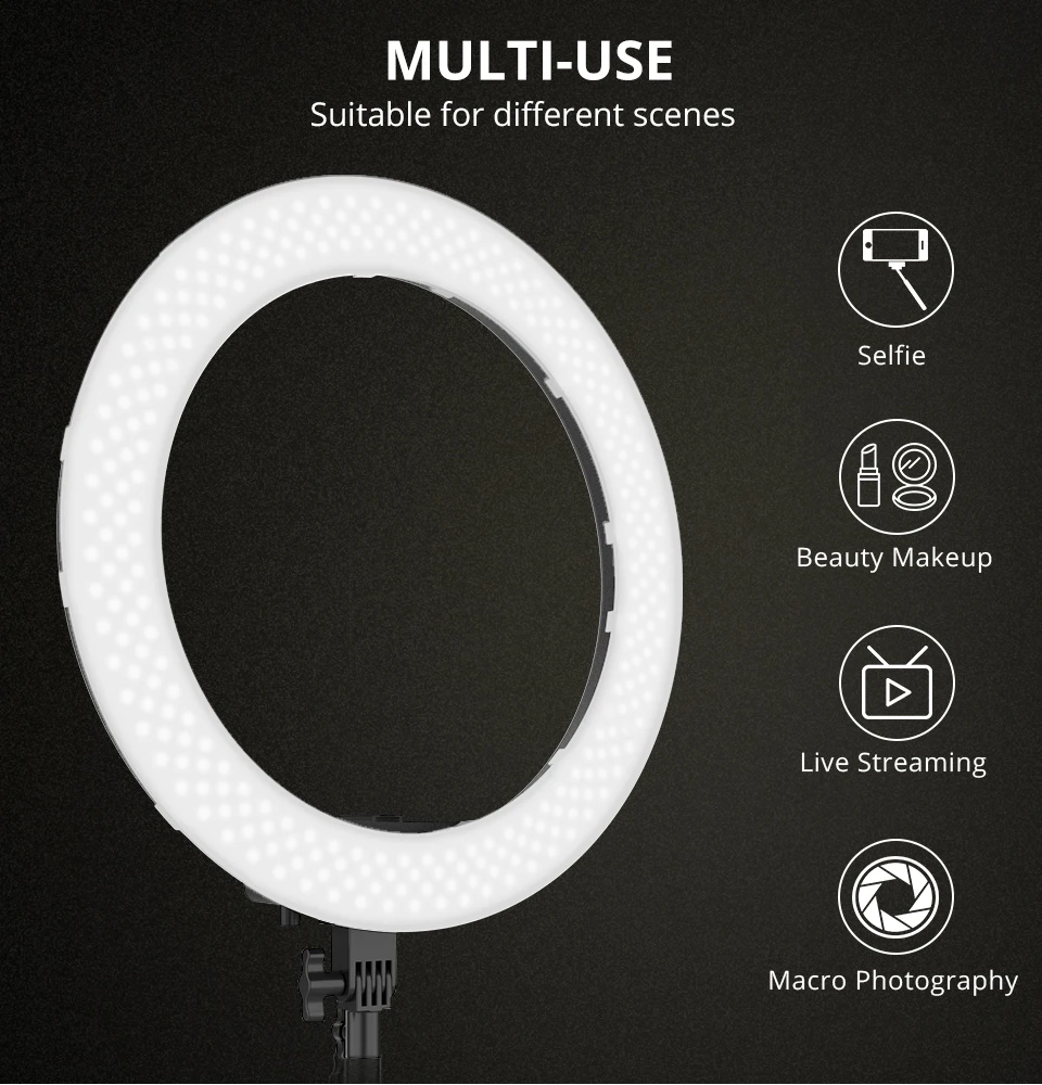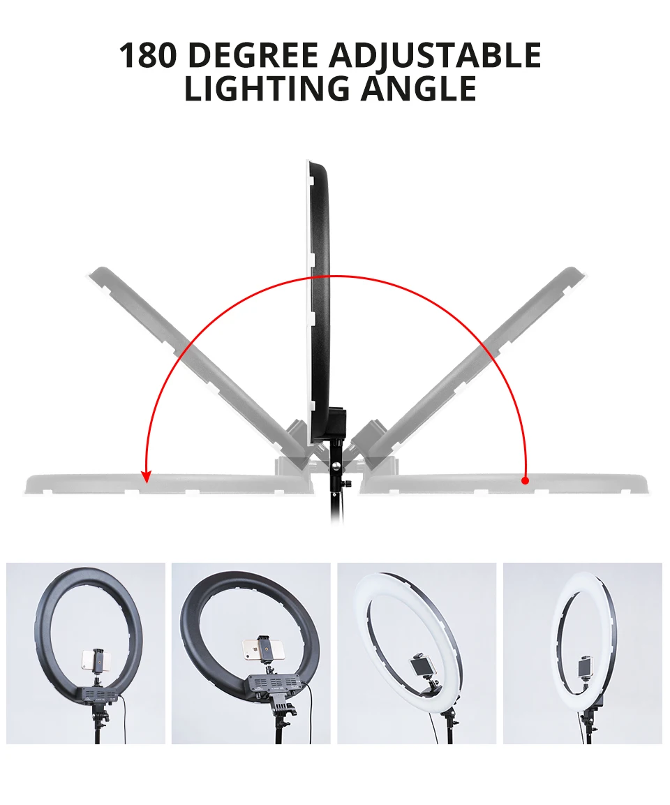Мягкий светильник-кольцевой Светильник обеспечивает эффект красоты под названием «ангельский глаз», что делает вас более очаровательным, когда люди видят светильник в ваших глазах. Светильник светится на лице, чтобы осветить цвет лица, маскирует недостатки, равномерно заполняет светильник, чтобы улучшить стереоскопический эффект лица, чтобы помочь вам привлечь больше подписчиков