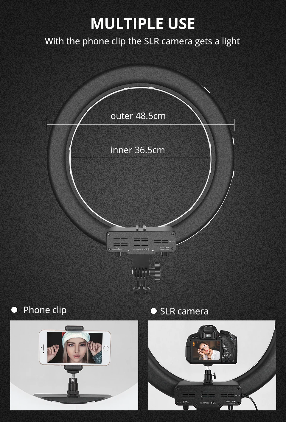 ★Посылка в том числе 1x RL-18 кольцевой светильник 1x Регулируемая подставка 2x фильтры (белый и оранжевый) 1 держатель для телефона (для телефонов шириной 55-82 мм) 1x адаптер для «горячего башмака» 1x зеркало для макияжа 1x Мощность адаптер 1x Портативный сумка