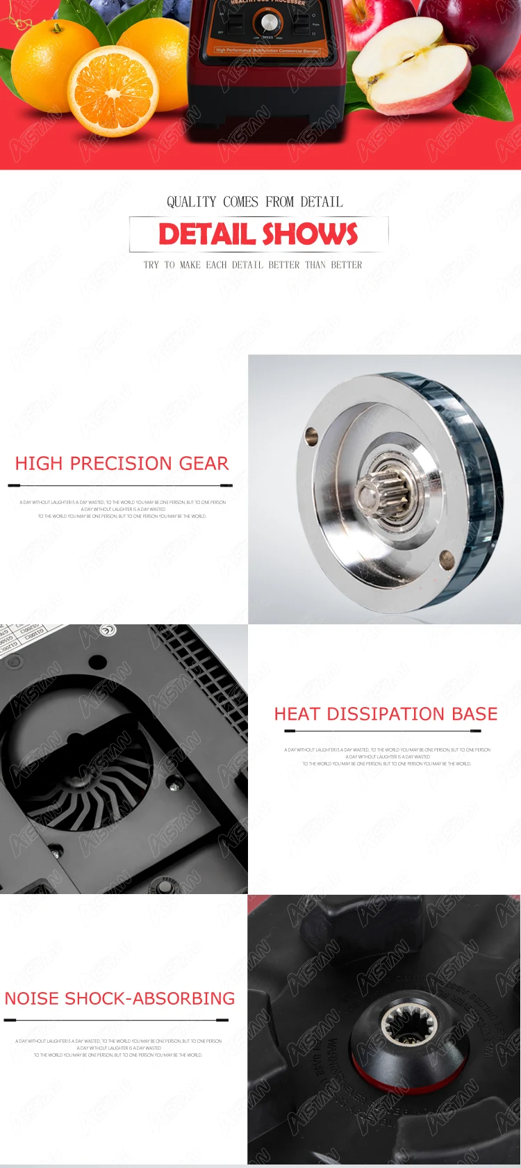 1. Закаленные лезвия из нержавеющей стали-японская оригинальная технология лезвия, будучи твердым и острым с более сильной прочностью и долгим сроком службы 2. Металлическая Соединительная система-вместо пластикового соединения, которое быстро изнашивается, использует металлическую соединительную систему для подключения контейнера к основанию двигателя-позволяет лучше сочетать и продлить срок службы. 3. 3. 3 л.с. мотор-Немецкая оригинальная моторная технология. 100% Медь интегрированная конструкция двигателя, 57000 скорости (об/мин) Убедитесь, что блендер может работать стабильно, низкий уровень шума, длительный срок службы, супер мощный. Уникальный дизайн может охладить двигатель быстро и действителен 4. Профессиональная система подшипников-двойной японский импортный подшипник NSK, срок службы которого в 5 раз больше, чем у обычных 5. Защита от перегрузки по току-автоматическое отключение при перегрузке по току или высокой температуре, защита блендера