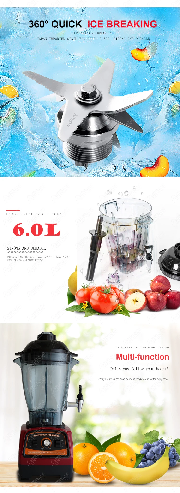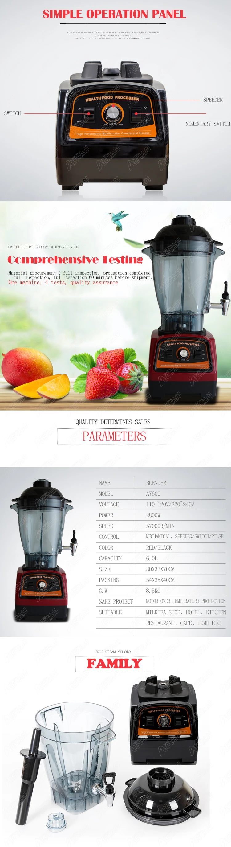 Размеры: 300x320x700 мм Лезвия: японская оригинальная технология лезвия HP: 3,3-peak Скорость: 57000rpm-peak Мощность: 2800 Вт (максимальная нагрузка) Напряжение: 110 В или 220 В Емкость: 6л (6000CC)