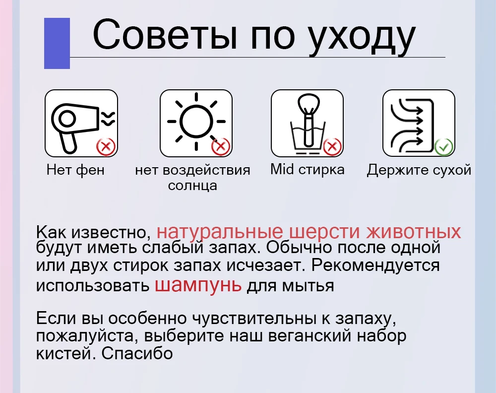 1. Смочите щетину теплой водой. (Ниже 40 ℃) 2. Поместите каплю моющего средства для макияжа 3. Слегка помассируйте кончики щетинок на ладони. 4. Промойте щетину. 5. Выдавите лишнюю влагу чистым полотенцем. 6. Измените форму и дайте ей высохнуть 7. Пожалуйста, не прикасайтесь к воде непосредственно с деревянной ручкой во время всей чистки