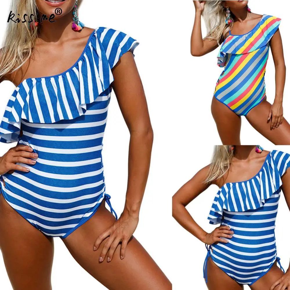 Спандекс и полиэстер цельный купальник 2017 сексуальная полоса кружевной купальник Женская летняя пляжная одежда одно плечо оборки пляжные купальники боди