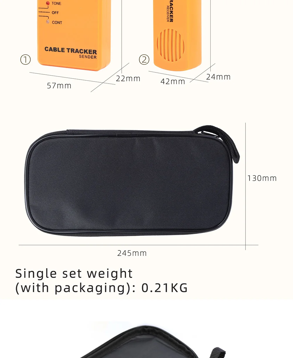 Функции: 1. Судите о непрерывности кабеля или проводов. 2. Отслеживайте кабель или провода и диагностируйте точку разрыва. 3.Rceiver сигнал тона на кабеле или проводах (телефонная линия). 4. Определение состояния сетевой телефонной линии (чистый, кольцевой, занят). 5. Отправитель сигнала твердого тона или двойного переменного тона к объектным кабелям или проводам. Спецификация: Цвет: желтый Материал: АБС + металл Приемник: кнопка включения/выключения, Тесты кнопка, 3,5 мм разъем для наушников Отправитель: Tone/Off/Cont переключатель Встроенный RJ-11 телефонный кабель: около 47 см Красный и черный Тестовый Кабель: около 61 см Приемник Размеры: 23x4x2,3 см Отправитель Размеры: 6,5x5,6x2,1 см Питание: аккумулятор 9 В (не входит в комплект) Посылка включает в себя: 1 x Кабель-излучатель 1 x Кабельный приемник 1 х сумка для переноски Руководство по эксплуатации-1 шт.