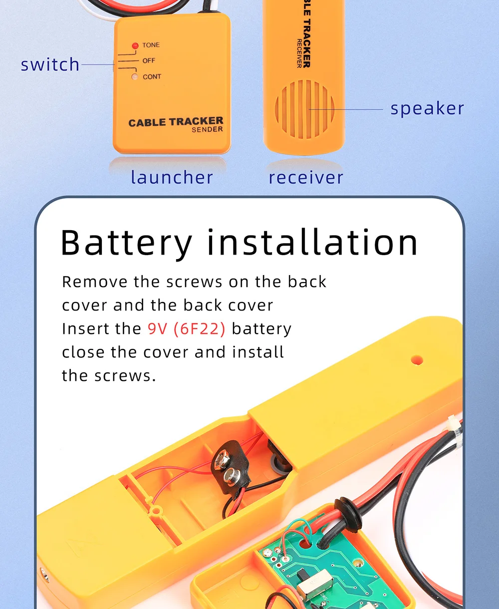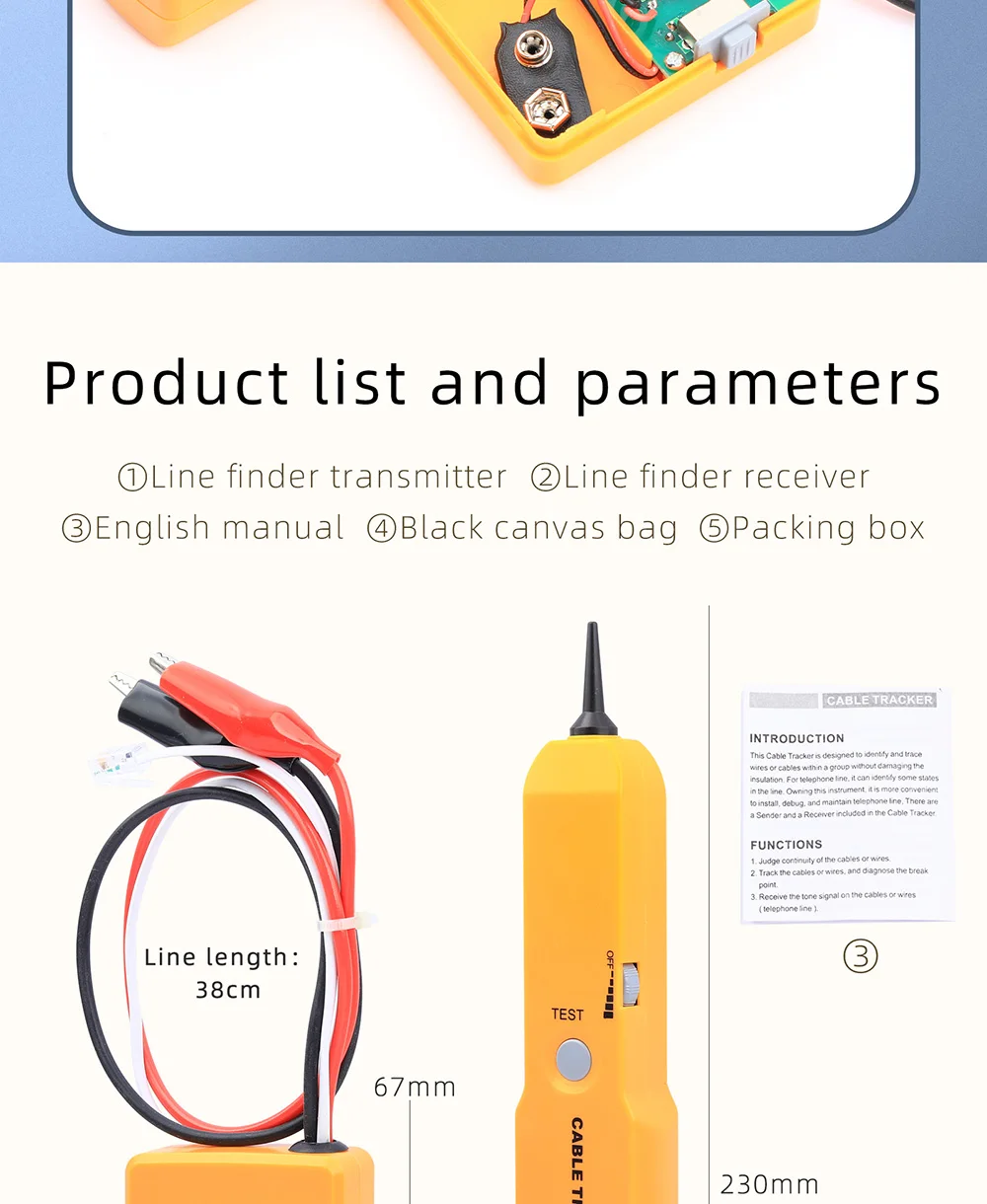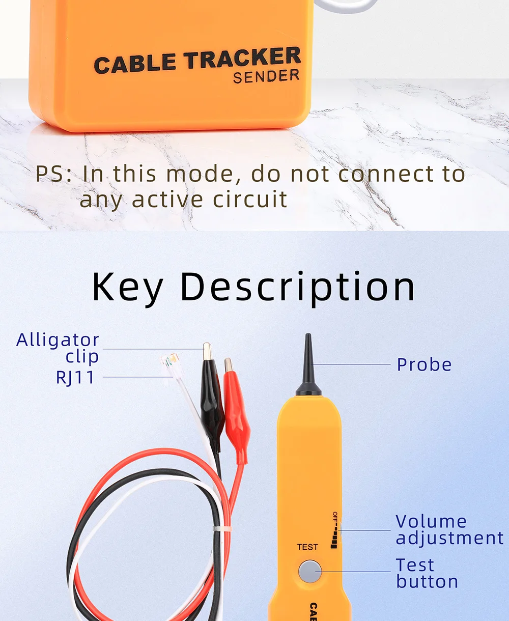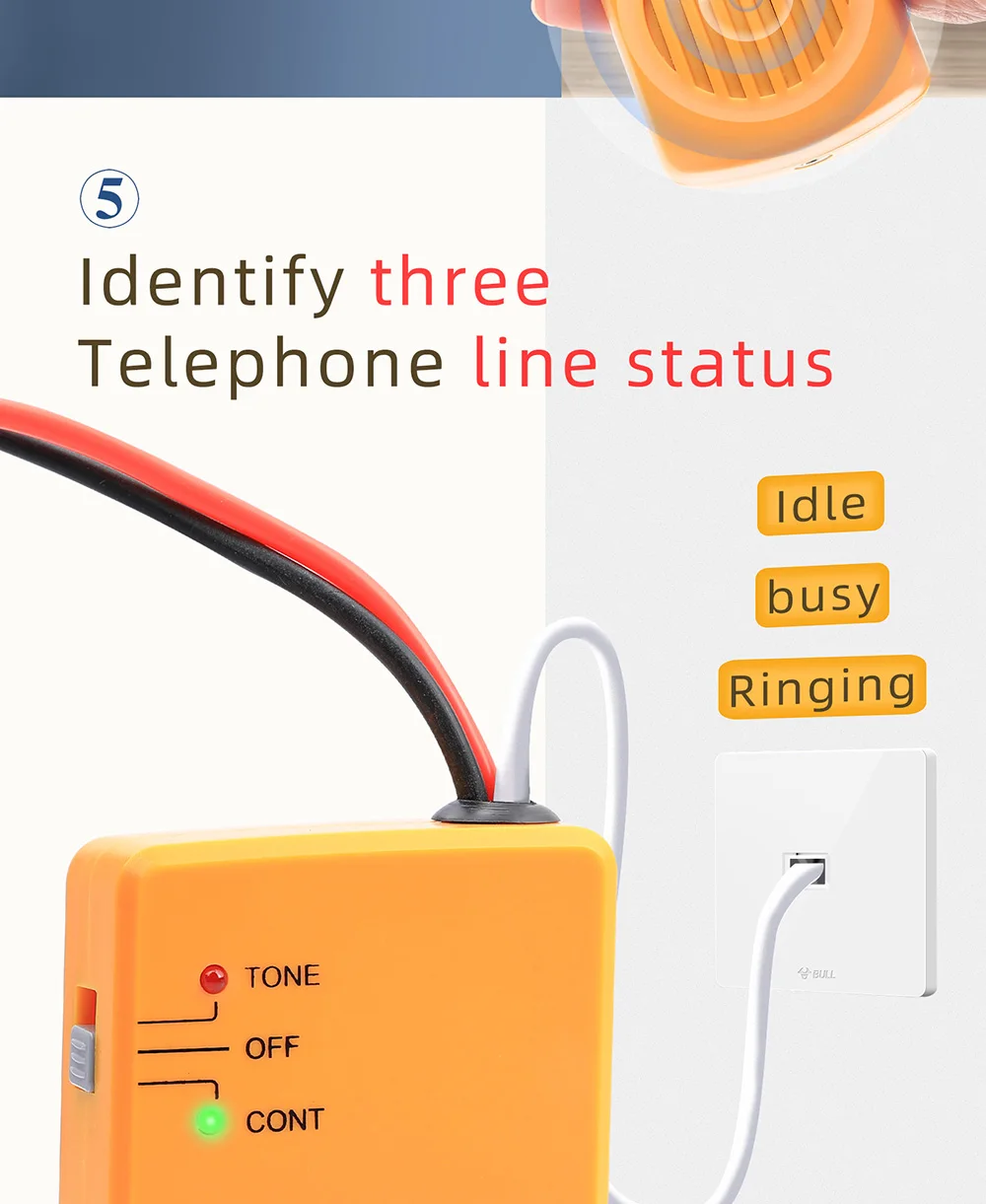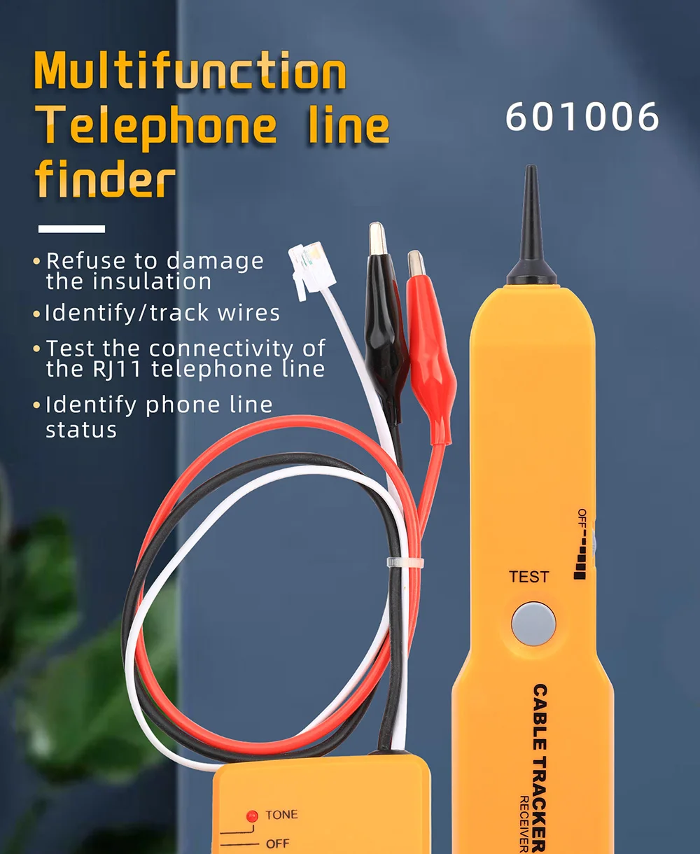 RJ11 Кабельный трекер предназначен для идентификации и отслеживания проводов или кабелей внутри группы, не повреждая изоляцию. Для телефонной линии, она может определить некоторые состояния в линии.