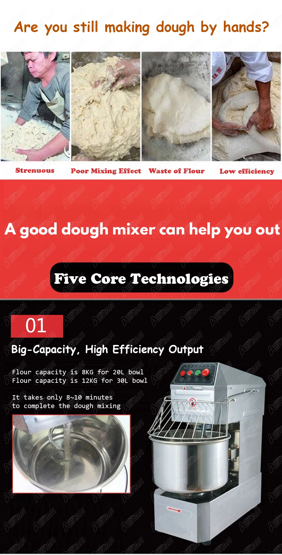 1. Большая емкость, высокая эффективность производства: Емкость муки составляет 8 кг для 20L чаши; Емкость муки составляет 12 кг для 30L чаши. Это занимает всего 8 ~ 10 минут, чтобы завершить смешивание теста 2. Нержавеющая сталь утолщенная чаша: 1,5 мм толщина Еда Класс безопасный Нержавеющая сталь Материал, безопасная и Гигиеничная. Утолщенная чаша, трудно деформируется, прочный и долговечный 3. Медный сердечник двигателя: двухскоростной двигатель, большой крутящий момент, длительный срок службы 4. Простая панель, простая в эксплуатации 5. Дизайн разделителя теста: помогает сделать муку в полном контакте с тестом.