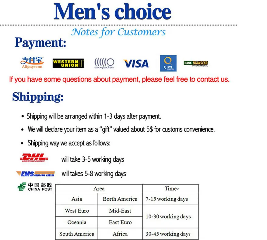 3). Любые предметы, порядок должны быть отправлены только после получения оплаты третьей стороной (банк) Мы отправляем товар для клиентов через авиапочту Китая, EMS, UPS, DHL, FedEx или воздушной почтой, согласно реальной ситуации.