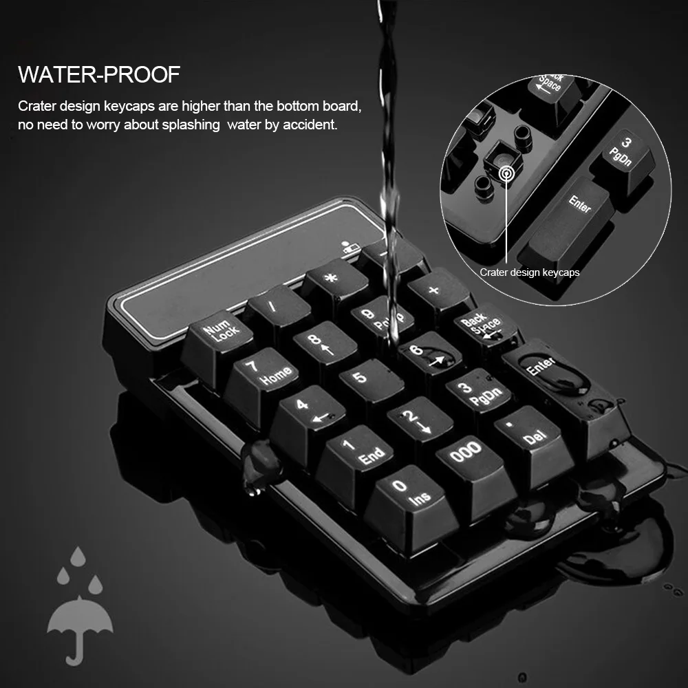 Класс водонепроницаемости:Кратер дизайн keycaps выше, чем Нижняя панель, не нужно беспокоиться о брызге воды случайно.