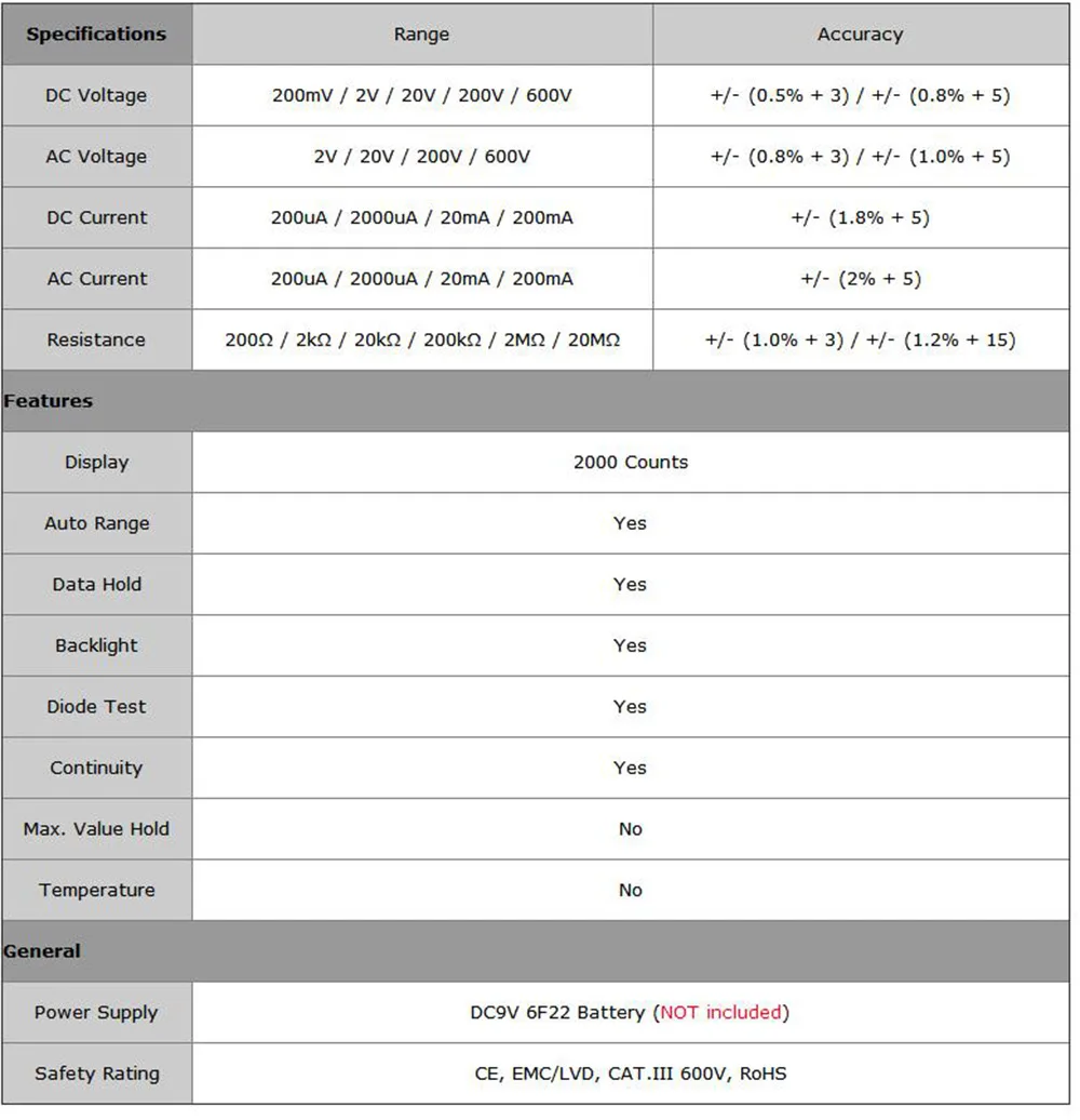 Прибор может измерять напряжение постоянного тока, напряжение переменного тока, ток постоянного тока, AC Ток, сопротивление, диода и подключения
