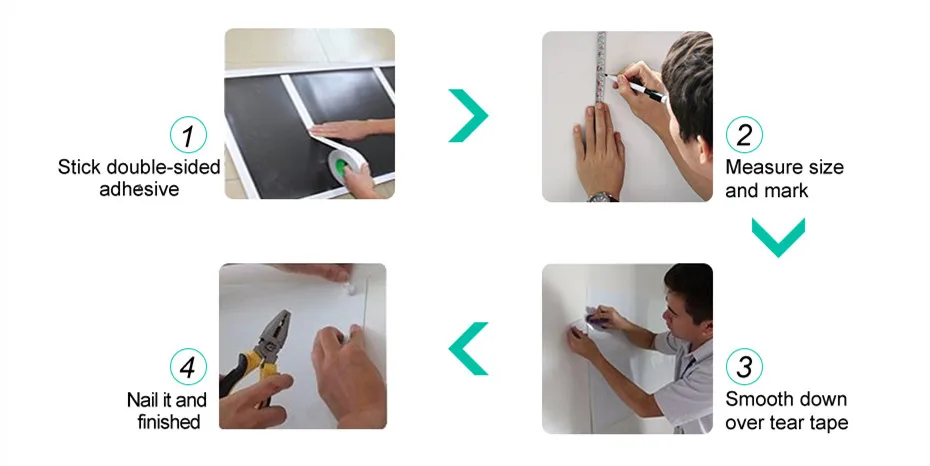 1. Двусторонний клей 2. Измерьте размер и отметьте. 3. Гладкий вниз по разрывной ленте. 4. Пригвоздите его и закончите