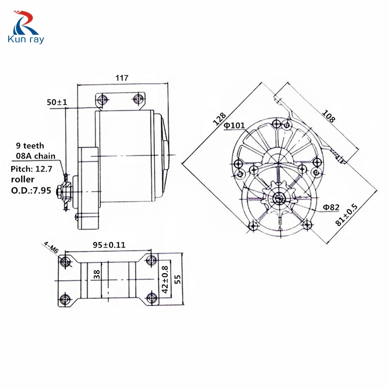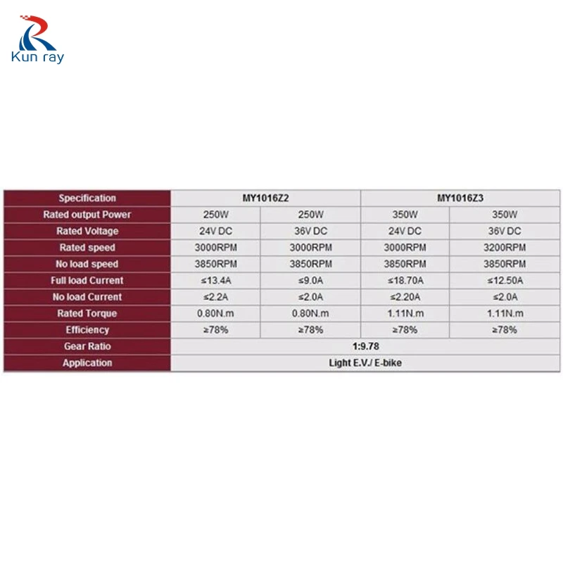 1. Номинальное напряжение: 24 В постоянного тока/36 В постоянного тока 2. Мощность: 350 Вт 3. Номинальная скорость: 24 В постоянного тока 3000 об/мин 36 В постоянного тока 3200 об/мин 4. Без скорости нагрузки: 3850 об/мин 5. Номинальный крутящий момент 1.11N.m 6. Модель: UNITEMOTOR MY1016Z3 7. Название: 24V/36V электродвигатель постоянного тока 8. Использование: электровелосипед, сделай сам 9. Зубцов: 9 шаг: 12,7 10. Передаточное отношение: 1:9.78 11. Тип установки: мотор с ножкой