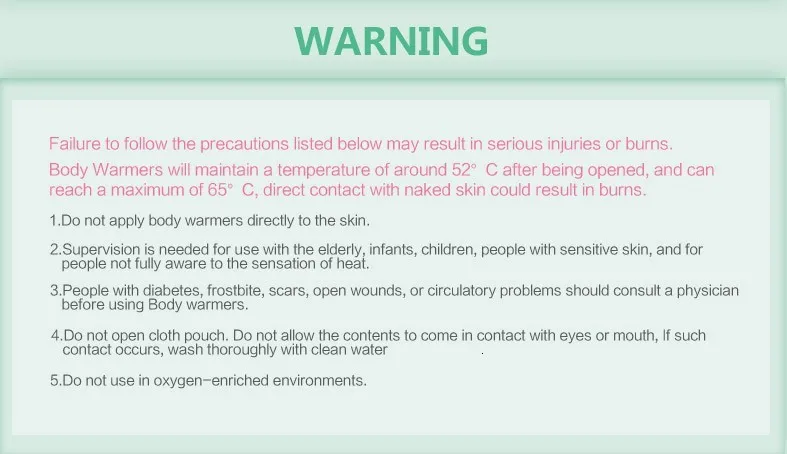 Когда нагревательный материал контактирует с кислородом в воздухе, он начинает оксигенацию, этот процесс будет постоянно выдавать тепло для8-12 часов По крайней мере. Этот процесс начнется только после того, как вы сломаете вакуумную упаковку. Офисные работники и студенты, облегчение ревматизма, артрита, боли в талии и ногах, облегчение дисменореи, аномальные менструации, путешественники, особенно любителей активного отдыха, люди, которые носят свадебное платье.