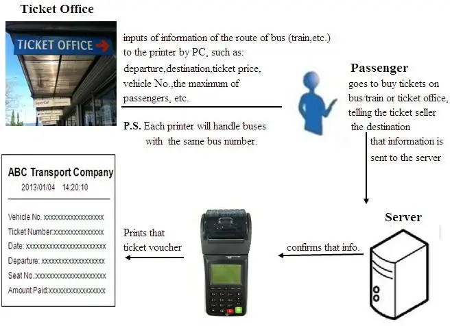 3) проводник выбирает начальную/конечную станцию, автобусный билет будет распечатан автоматически, затем принтер отправит обратный вызов на сервер.