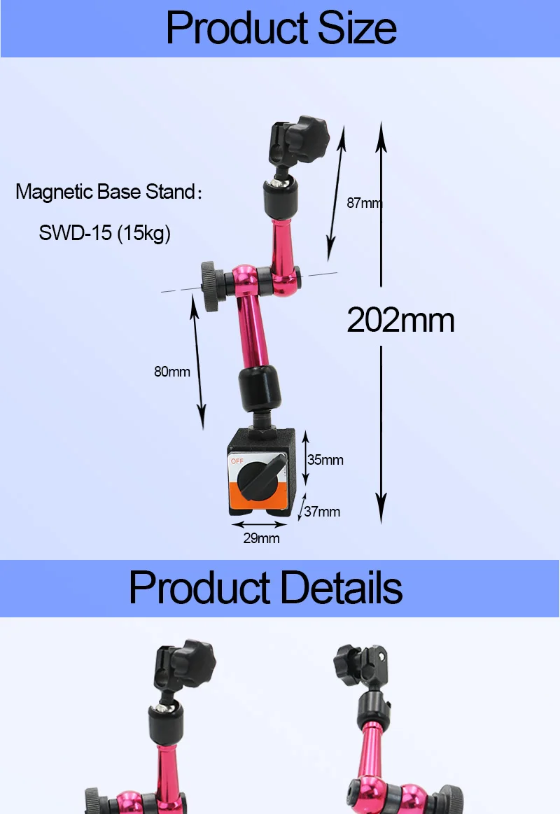 Магнитная подставка, которая использует переключаемый Постоянный магнит для удобного крепления на плоских железных или стальных поверхностях. Рукоятка может быть гидравлически заблокирована в любом положении с помощью ручки на вертикальном положении. Полезно для удержания индикаторов циферблата или индикаторов тестирования циферблата во время операций выравнивания.