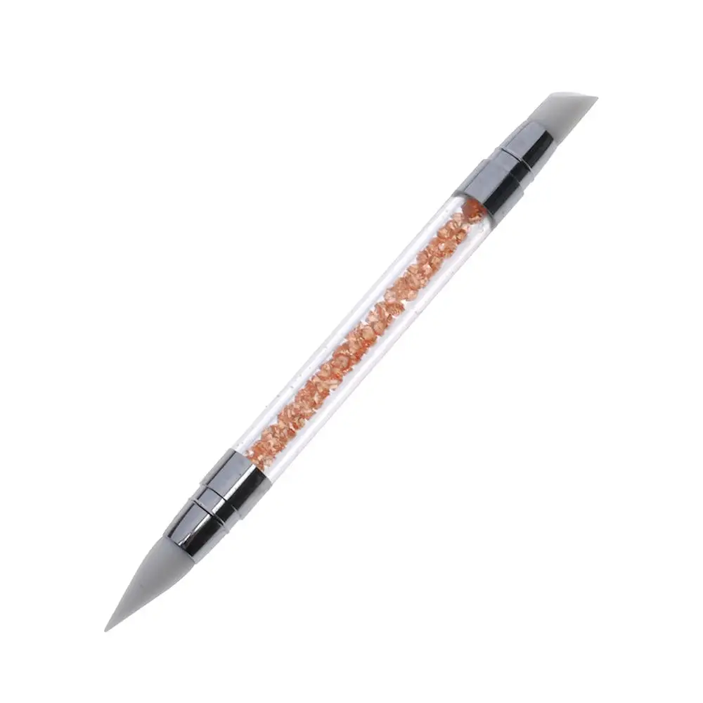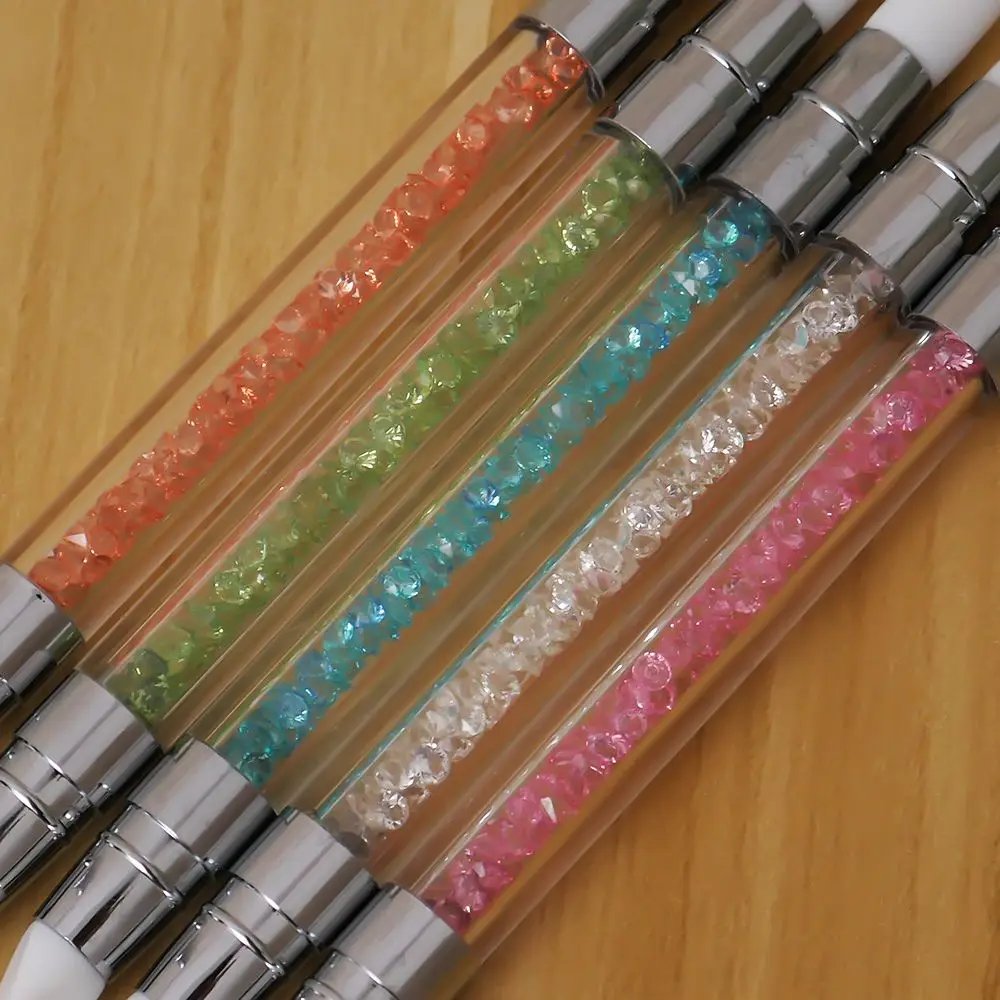 Акриловая ручка с Стразы внутри и металлический наконечник с силиконовой головкой.