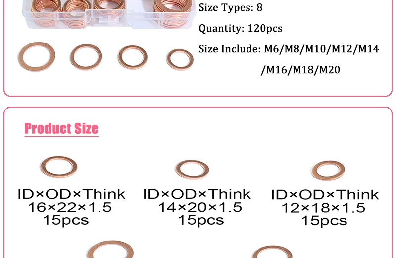 120 шт. Профессиональный M6 toM20 Ассорти медная шайба прокладка Набор плоский