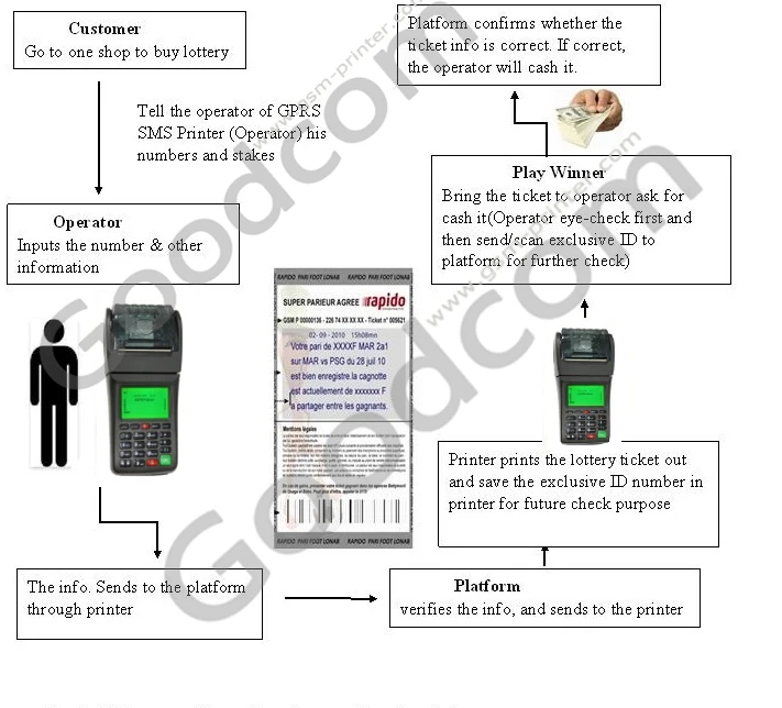 Подключение через sms, gprs или wifi, он может добраться до конца базы данных непосредственно, чтобы получить информацию о лотерейном билете напечатаны.