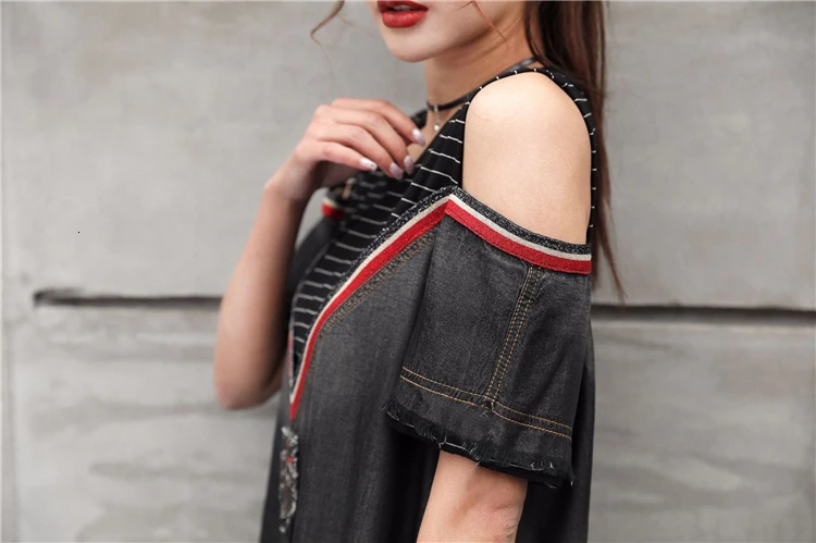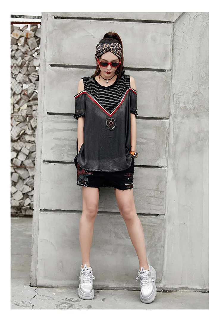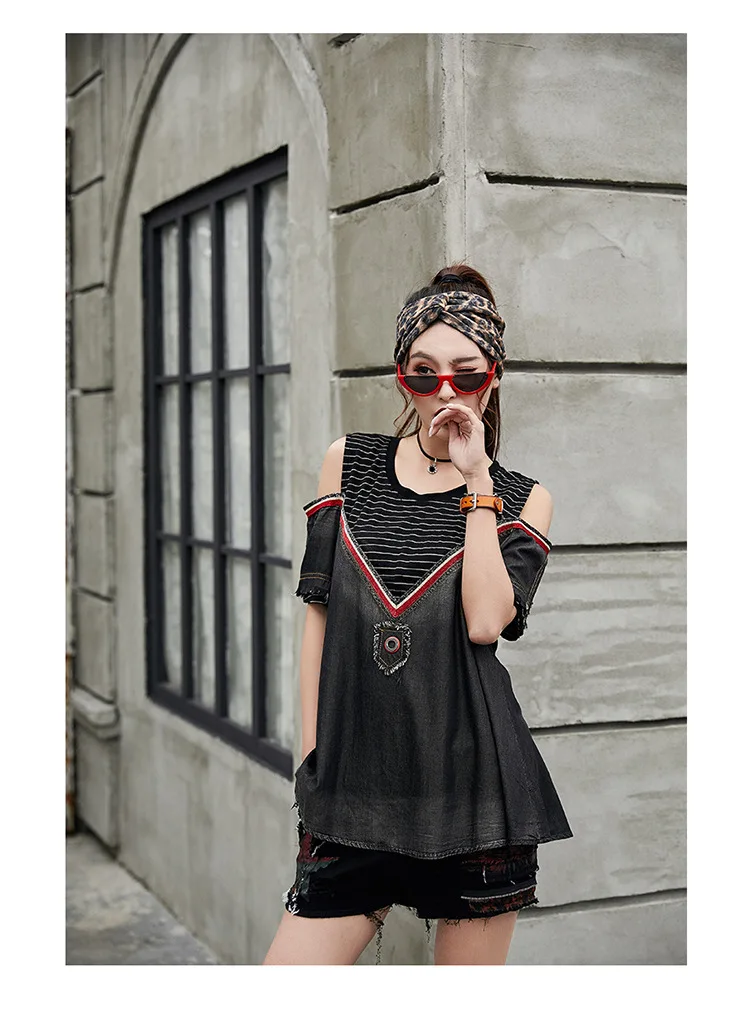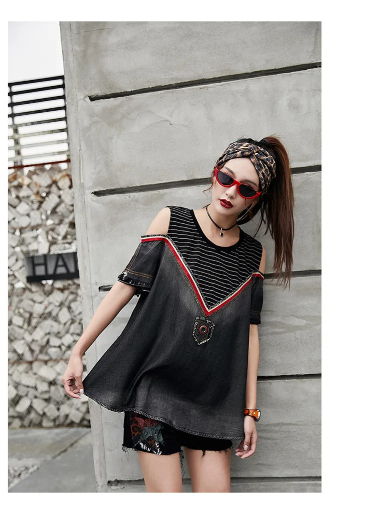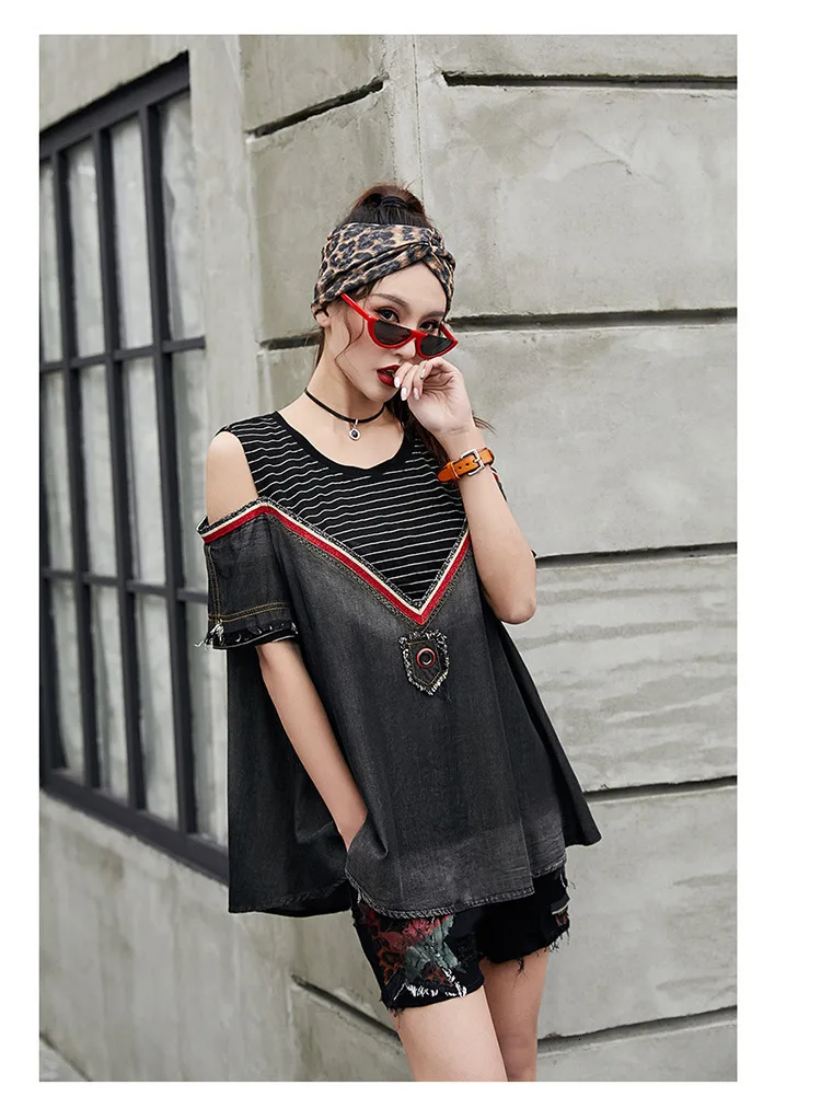 Роскошный сексуальный с открытыми плечами в стиле панкДжинсовая футболка