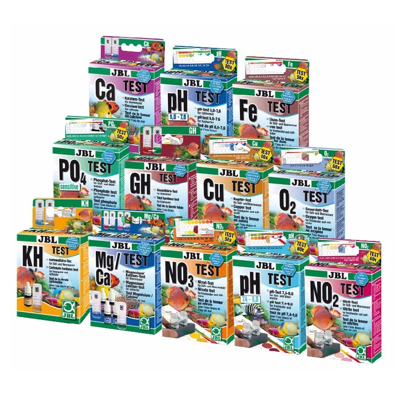 Оригинал сделано в Германии от JBLJBL набор для проверки воды PH NO2 NO3 Ca Mg Cu O2 CO2 PO4 NH4 GH KH FeПосылка включает: