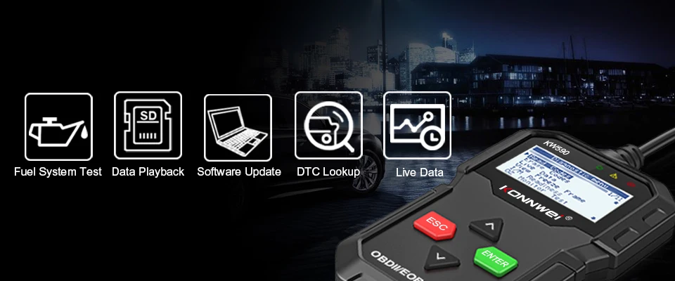 KW590 Введение: Новый сканер KONNWE KW590 OBD2 имеет уникальные запатентованные кнопки логической навигации, экран с TFT подсветкой и встроенный динамик. KONNWE KW590-это действительно конечная простота и доступная цена, позволяющая пользователям проверять ремонт, дорожное испытание, состояние проверки, состояние мониторинга выбросов и решать проблемы с системами двигателя и возможностями привода. Диагностические функции автомобиля KW590 намного выше и полностью превосходят другие модели, такие как AD310 или NT201, по гораздо более доступной цене. Кроме того, KW590 поддерживает одно нажатие обновления и печать диагностических отчетов с ПК.