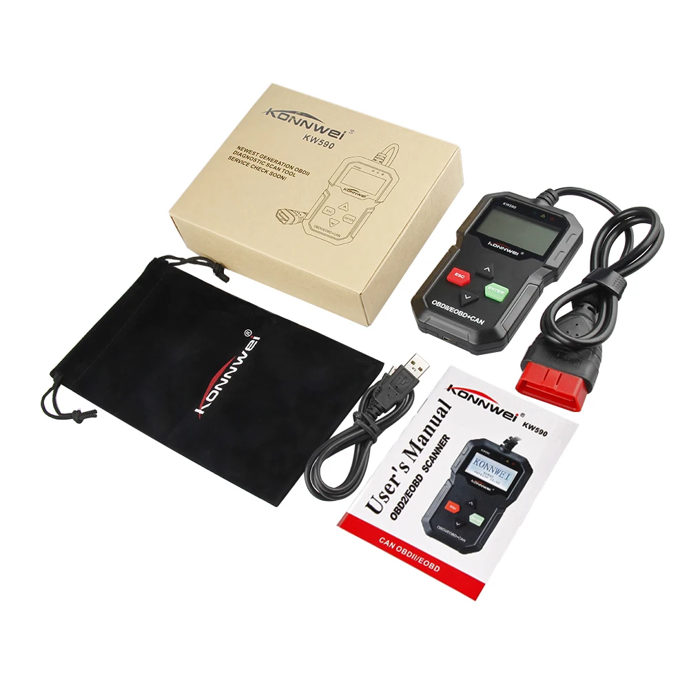 1 * OBD2 сканер KONNWE KW590 1 * Руководство пользователя на английском языке 1 * кабель OBD2 1 * USB кабель 1 * Бесплатная плюшевая сумка