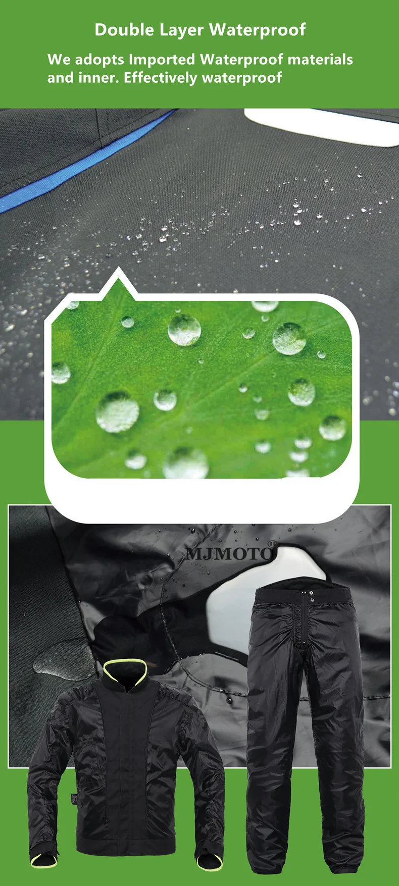 Износостойкая и водостойкая высокая производительность 600D полиэфирная ткань Подкладка из эластичной полиэфирной сетчатой ткани, дышащая и удобная Содержит съемный теплый хлопковый вкладыш, можно носить в холодную или теплую погоду Съемные 7 шт. сертифицированные Защитные пленки на спине, плечах, локтях и коленях Регулируемые манжеты, локти, воротник, талия, подол, улучшает диапазон посадки и комфорта Четыре внешних кармана на молнии на талии и ногах для хранения мелких предметов Светоотражающая полоса высокой видимости для ночной езды