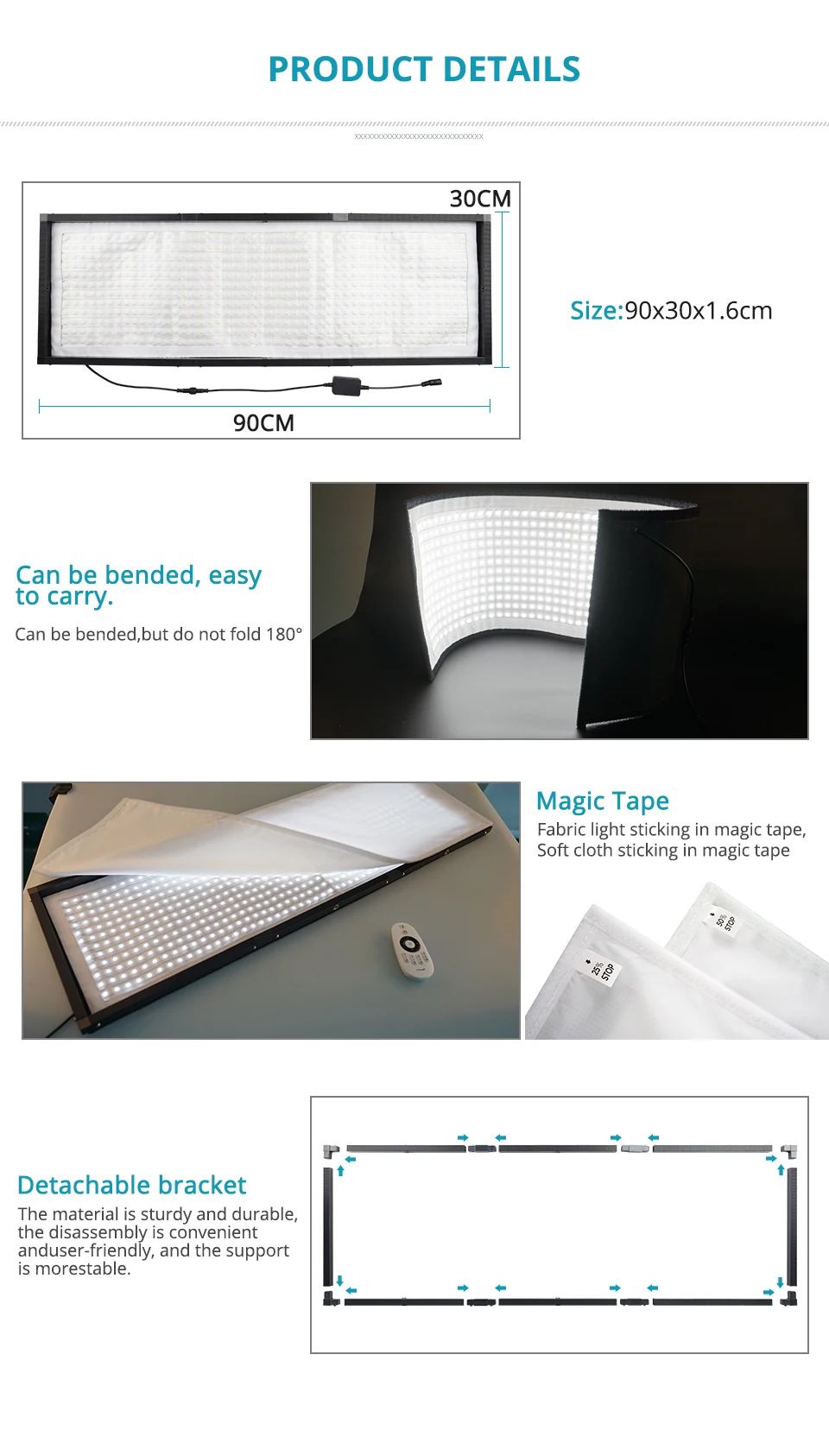 Яркость и цветовая температура регулируется, чтобы сделать наполнение светом, как вы хотите. Поставляется с мягкой тканью, чтобы сделать свет более равномерным и мягким.