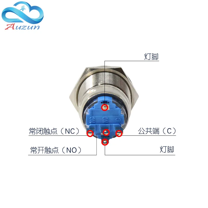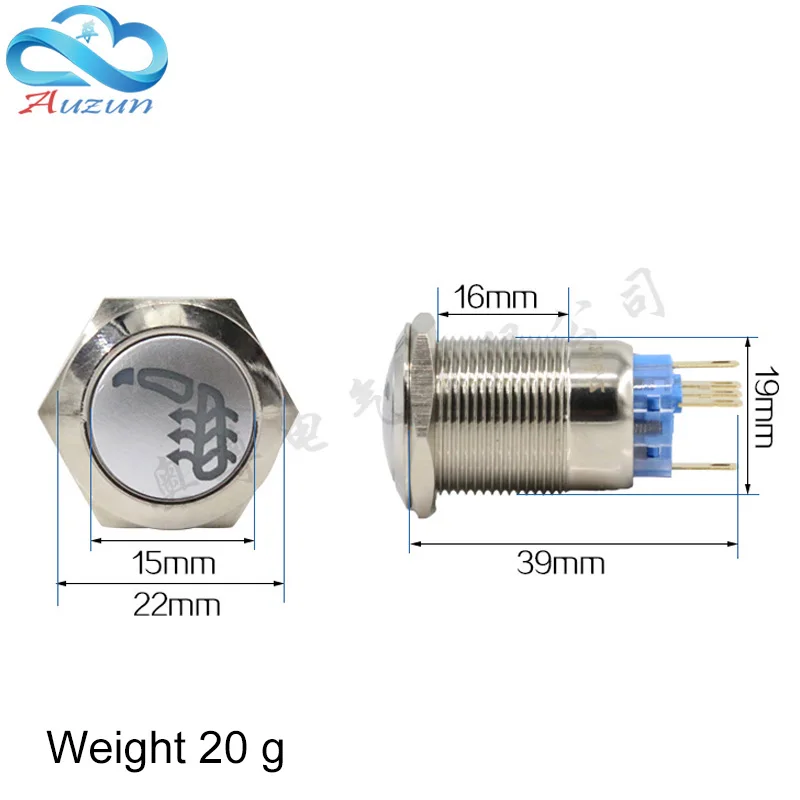 Open diameter: 19 mm Name: metal button ventilation push button switch Power rating: 5A / 250VAC (over 5A will damage the button) Protection grade: IP65 Shell material: copper-plated nickel Work: the self-locking button Environmental temperature: -25 to + 50 degrees Celsius Color: red, blue, white, red, green Voltage: 3 v.12V.24V.36V.48V.110v.220V Welding method: use soldering iron welding, power no more than 20 watts, no longer than 3 seconds, recommend base connection