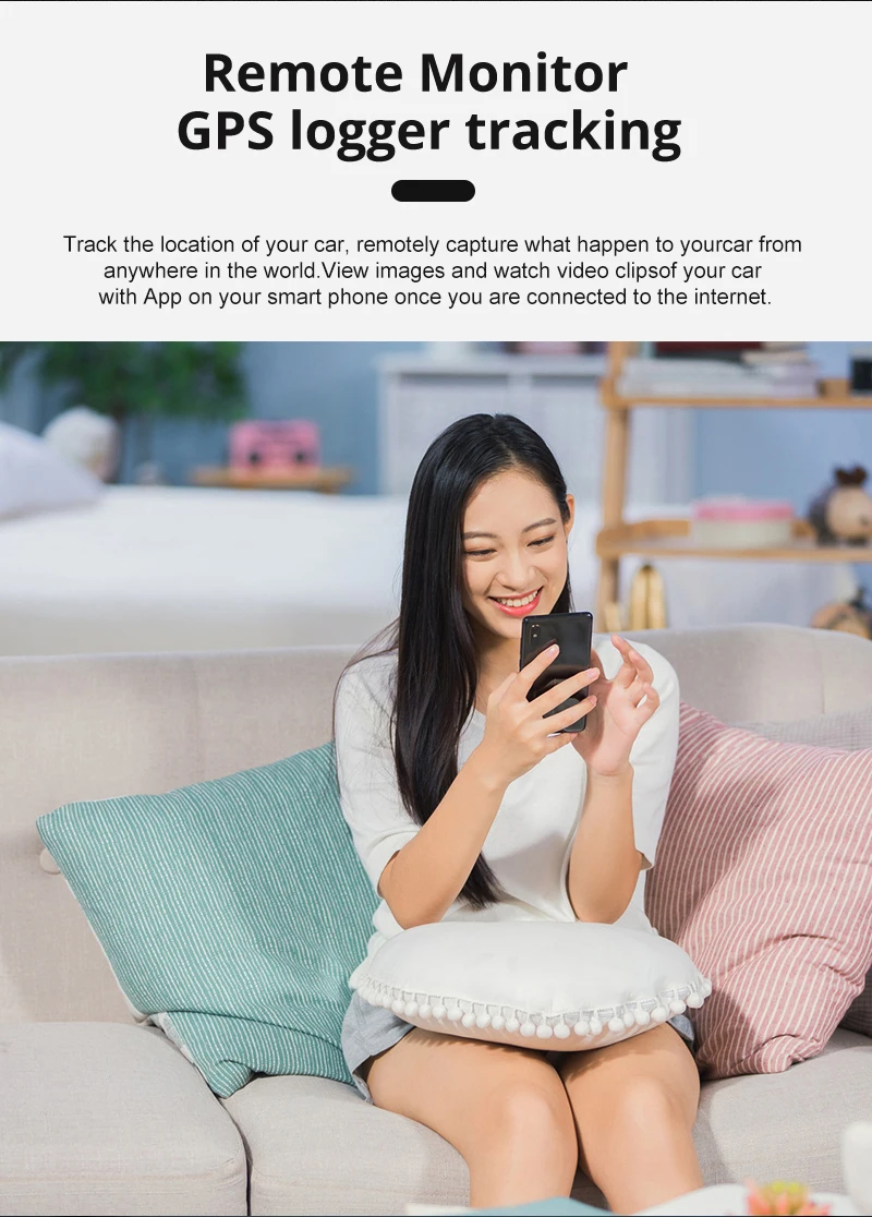 Монитор и сигнализация -Фото 720p и видеосигнал 10s будут отправлены в ближайшее время (1-5s время) на ваш мобильный телефон, если произойдет столкновение автомобиля История gps-трека -Ваш путь вождения автомобиля будет записан и воспроизведение в режиме реального времени в приложении car assist. Видео с одним нажатием кнопки -Один ключ для записи видео 10s в приложении car assist через Wi-Fi соединение