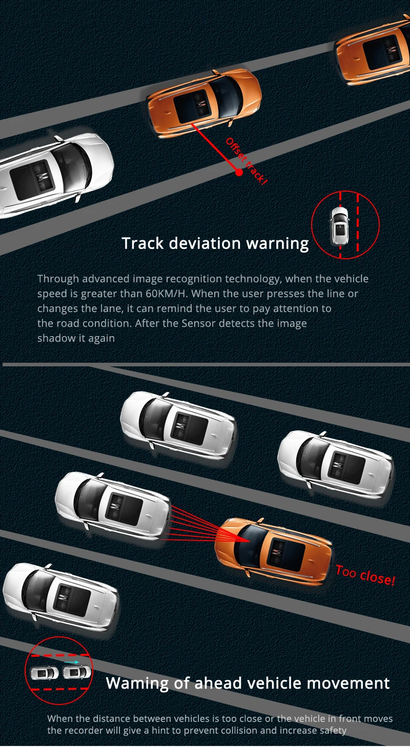 LDWS Предупреждение системы предупреждения о выходе из полосы движения Предупреждение срабатывает при обнаружении вылета полосы движения на основе записанного видео в реальном времени. FCWS Предупреждение о столкновении вперед Предупреждение срабатывает при обнаружении возможных столкновений вперед на основе видео в реальном времени. FVMA -Движущийся сигнал движения транспортного средства Предупреждение срабатывает, когда автомобиль впереди вас движется на основе видео-рекордера в реальном времени.